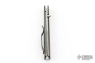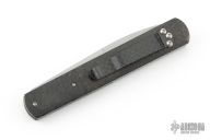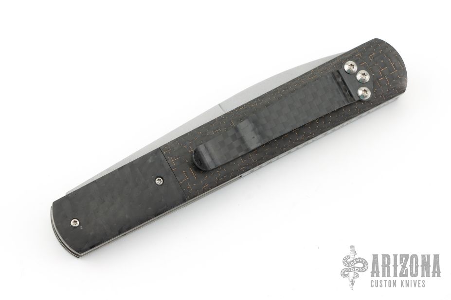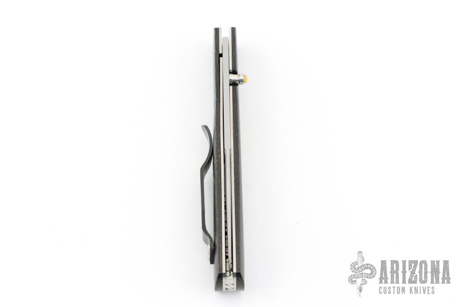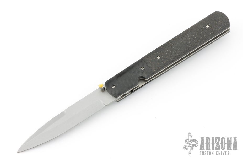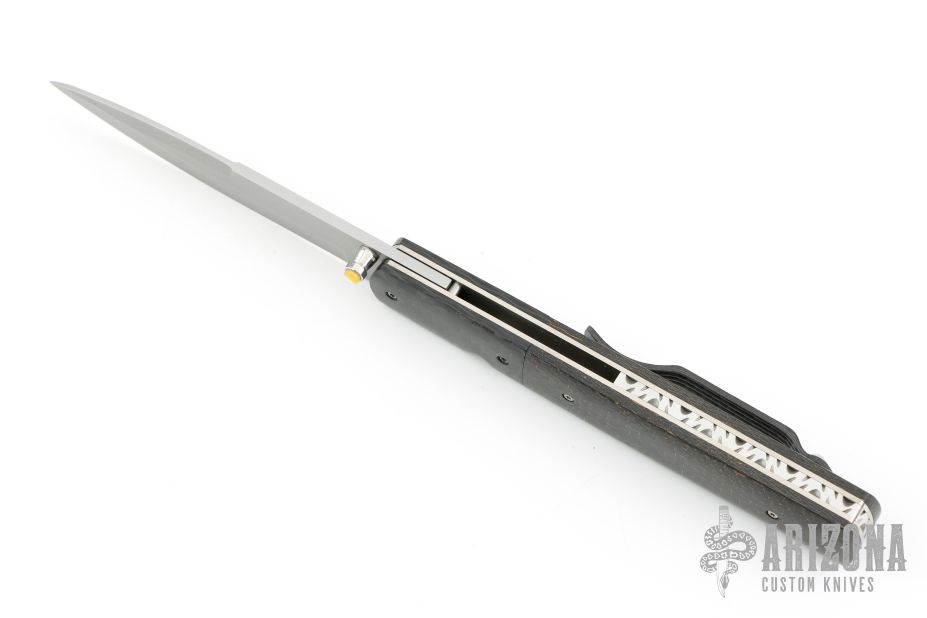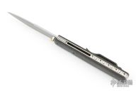 This knife by David Steier features a spear point bead blasted blade with false top edge and a single thumbstud with gold lip pearl inlay. The handle has carbon fiber bolsters and lightning strike carbon fiber scales, titanium liners and a fileworked stainless steel backspacer, tip up carbon fiber clip. Nice blade seating, detent and lockup. Comes with Velcro case. New from maker!