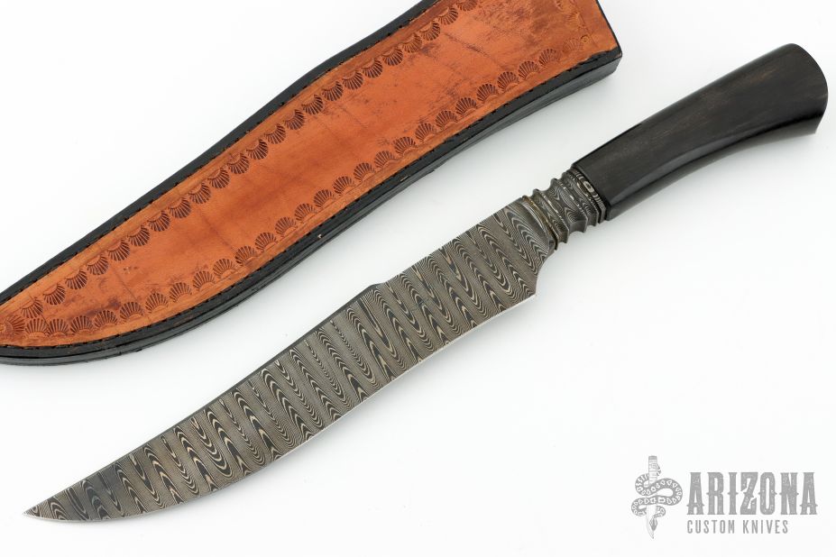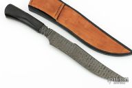 This knife by Jocha Knives features a Ladder Pattern Damascus blade with false top edge and an integral fluted guard, .168" blade stock and 1.423" blade depth, hidden tang construction. The handle has an ebony wood grip. Comes with a hand tooled brown/black leather sheath. Comes with a cloth bag and COA. New from maker!