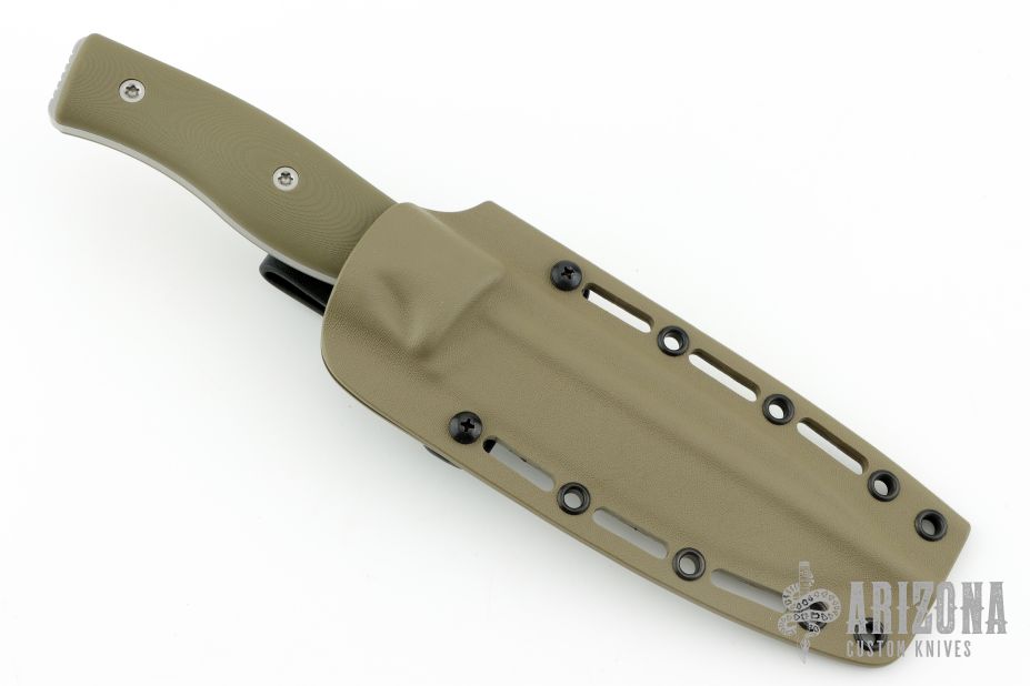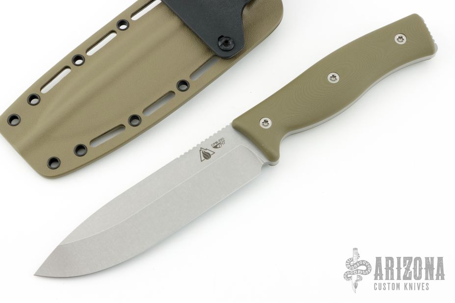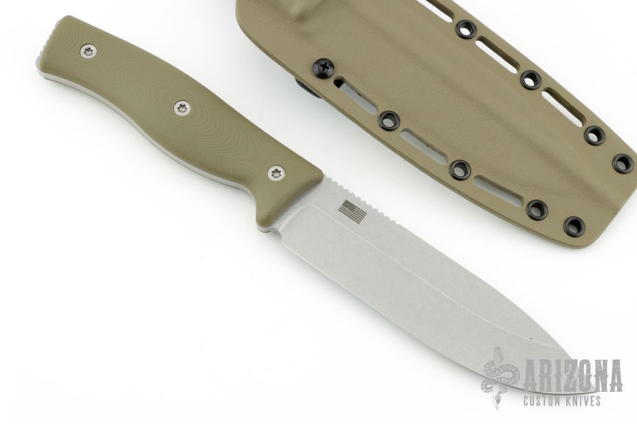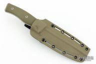 This GSO 6.0 from Survive Knives features a tumble finished drop point blade with notched thumbrest, .189" blade stock and 1.520" blade depth, full tang construction. The handle green G-10 scales. Exposed tang pommel with lanyard hole. Includes kydex sheath with belt loop and original box. Excellent condition.