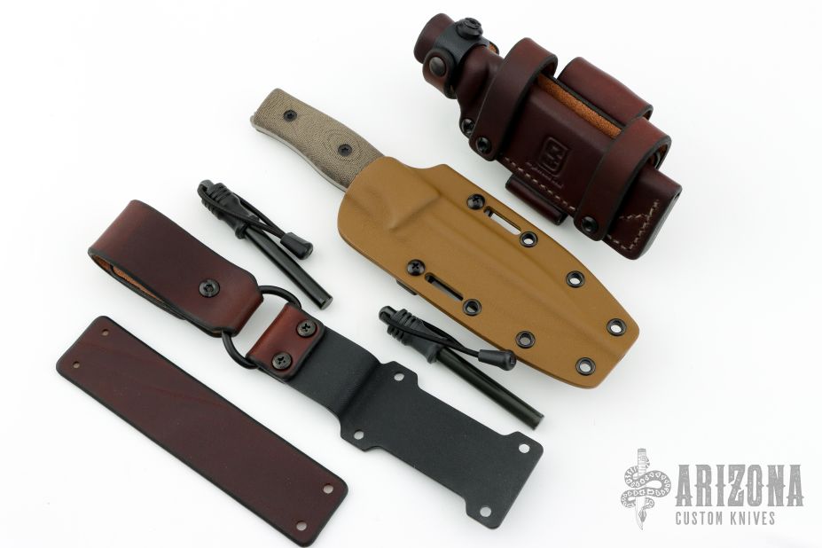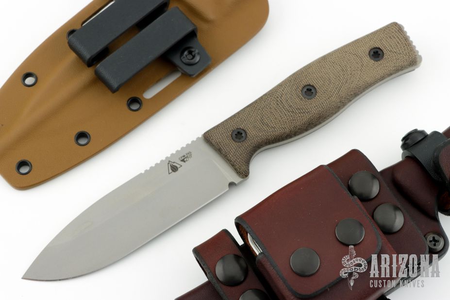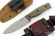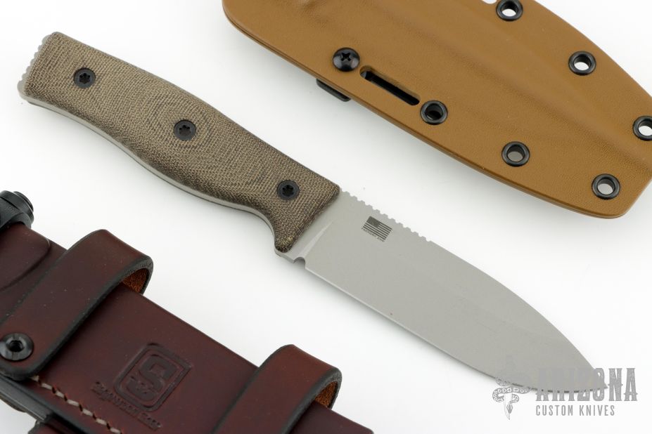 This GSO 4.1 from Survive Knives features a bead blasted drop point blade with notched thumbrest, .161" blade stock and 1.275" blade depth. The handle green canvas micarta scales over full tang construction. Notched exposed tang pommel with recessed lanyard bail. Includes kydex sheath with belt loop and original box. Excellent condition. Factory Second, but I can't find anything wrong with it. Comes with a brown leather scout carry sheath with auxiliary pouch by Sagewood Gear.