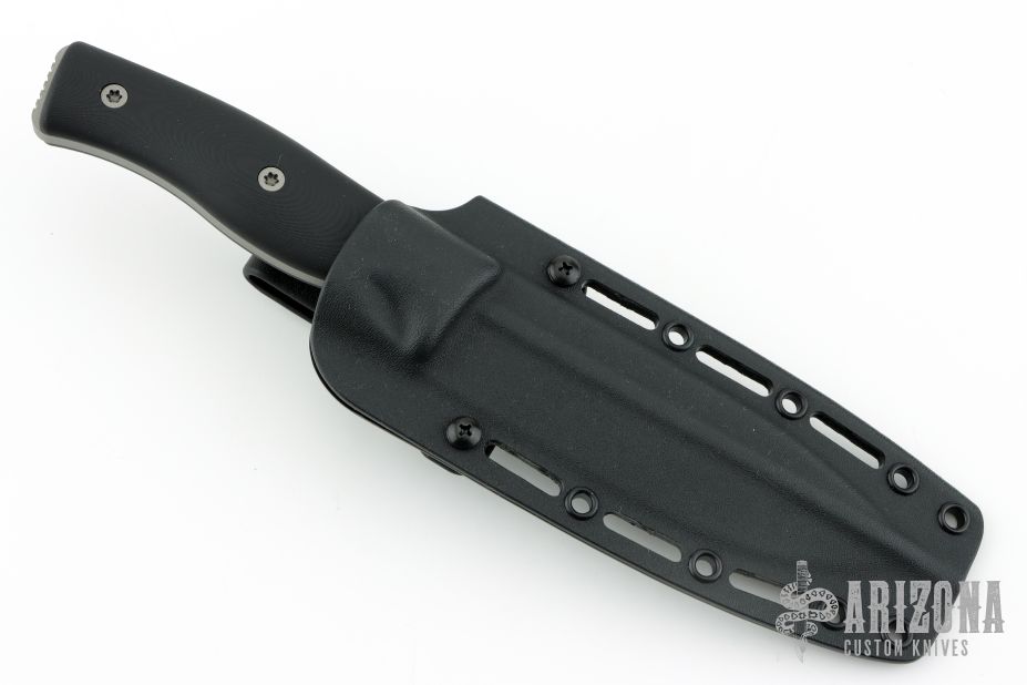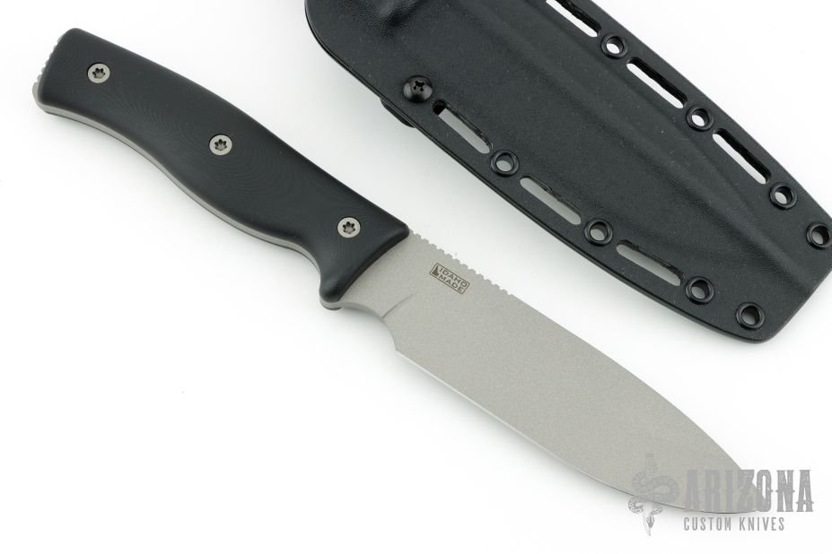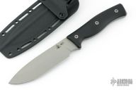 This GSO 5.1 from Survive Knives features a cerakote drop point blade with notched thumbrest, .192" blade stock and 1.509" blade depth, full tang construction. The handle has black G-10 scales over full tang construction. Includes kydex sheath and original box. Excellent condition.