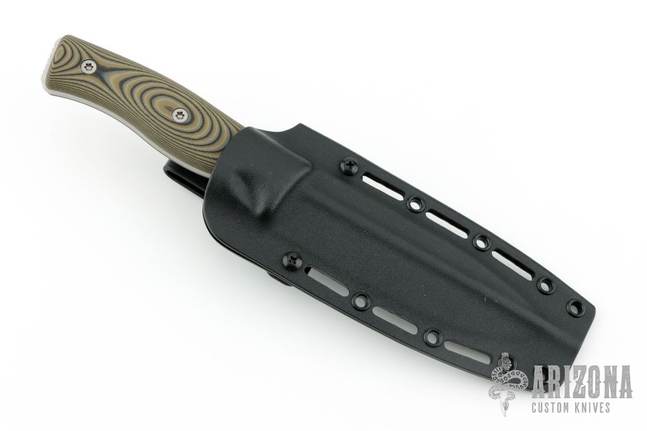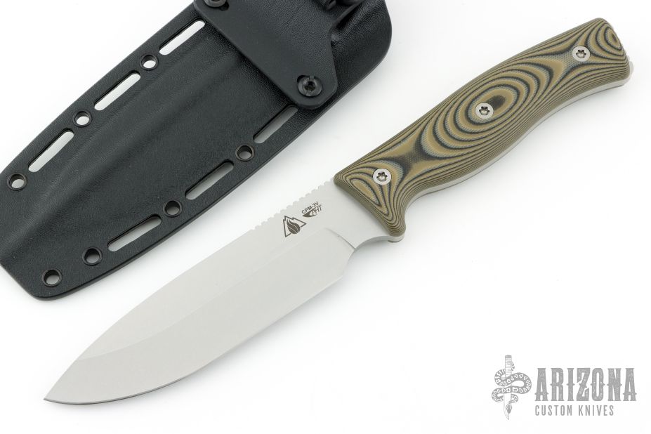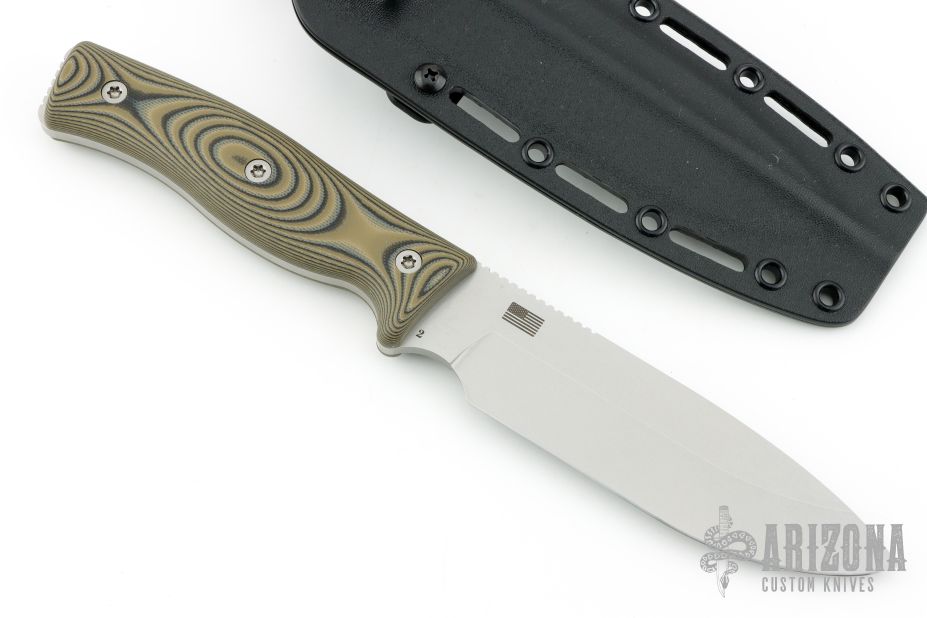 This GSO 5.1 from Survive Knives features a stonewashed drop point blade with notched thumbrest, .191" blade stock and 1.509" blade depth, full tang construction. The handle has black/green G-10 scales over full tang construction. Includes kydex sheath and original box. Excellent condition. Factory 2nd, but i can't find anything wrong with it.