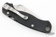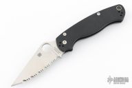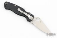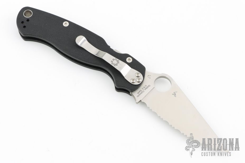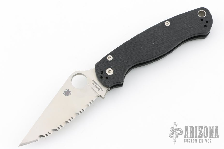 This Paramilitary from Spyderco has a satin finished clip point blade with thumb hole notched thumbrest and serrations. Handle is black G-10 with stainless steel liners and a black stainless steel clip. Excellent condition. Comes with original box and papers.