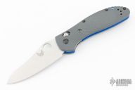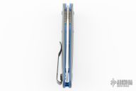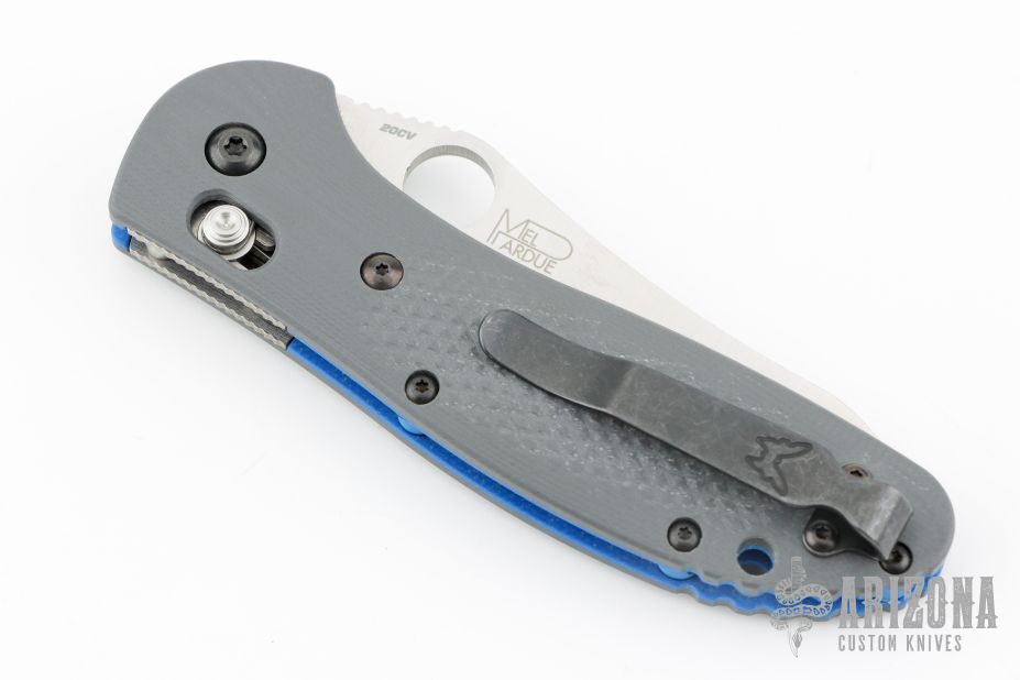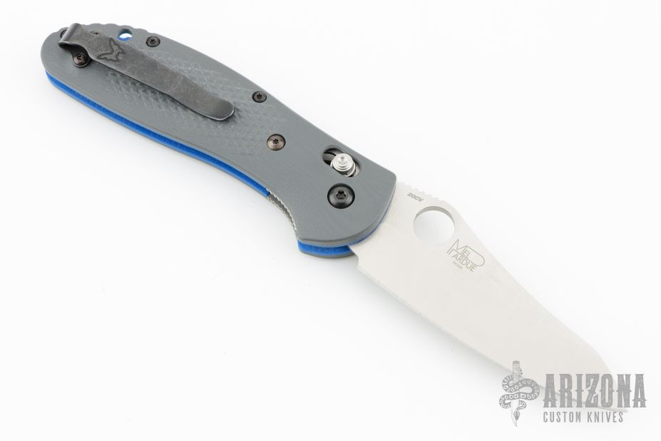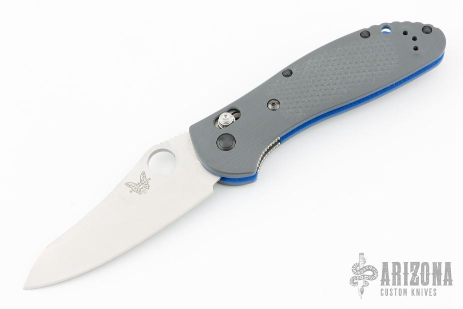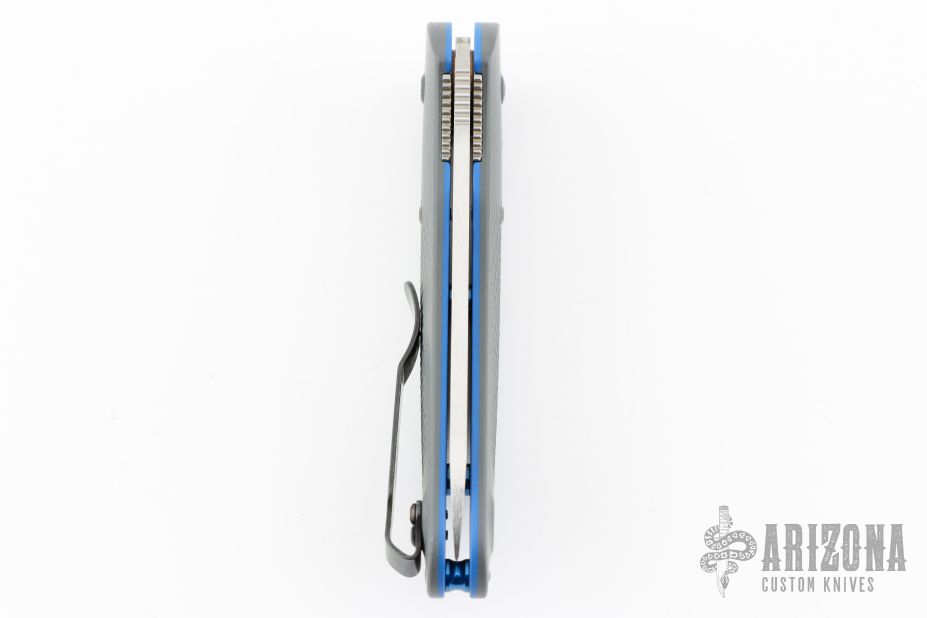 This Griptilian 550-1 by Benchmade features a stonewashed blade with swedge, notched thumbrest and dual thumbstuds. The handle has textured grey G-10 scales with blue G-10 liners, blue anodized barrel spacers. The pocket clip can be reversed for right or left tip up carry. The AXIS lock system makes the knife easy to open and easy to close. Comes with original box, draw-string pouch and papers. Has some scuffs on the clip. Excellent condition.