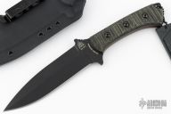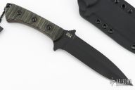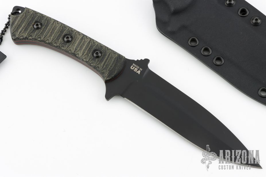 Blade has a black coated and is .158" thick and 1.397" deep. Full tang construction. Black canvas micarta ribbed handle with red liners. Comes with original box, and kydex sheath. Excellent condition.