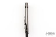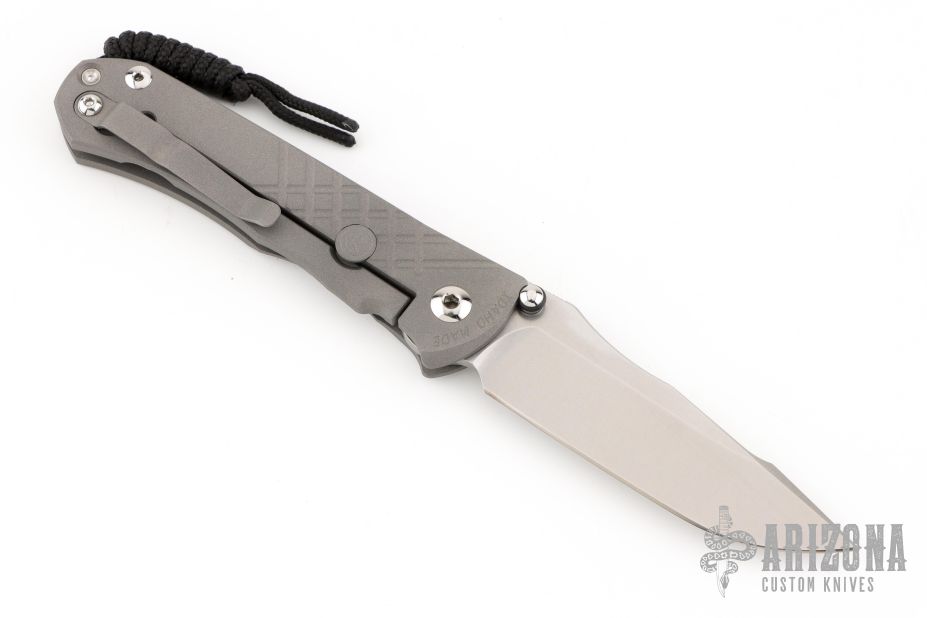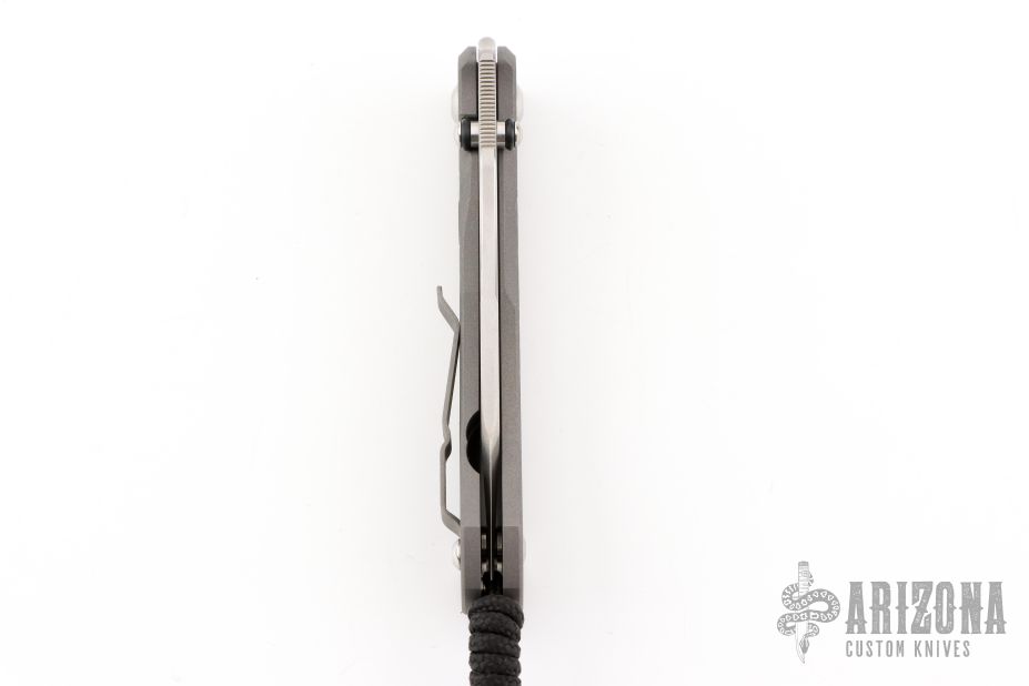 This Unumzaan from Chris Reeve Knives features a stonewash finish blade with dual thumb studs and notched thumbrest. The handle has a bead blasted and milled titanium with matching tip up clip. Lanyard pin with lanyard and spacer bead in pommel. Comes with original box, tools and papers dated June 11, 2025. New condition.
