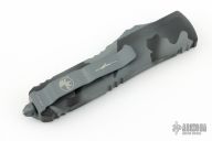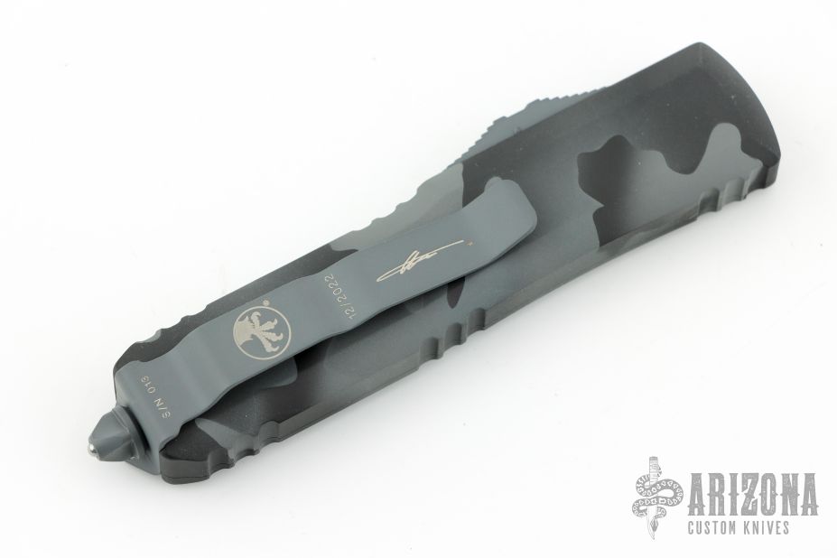 This UTX-85 by Microtech features a fully serrated tanto blade with Urban Camo coating. The handle has an Urban Camo coated aluminum frame with Urban hardware and tip down clip. Comes with original box and papers. Dated 12/2022 and s/n 013. Excellent condition.
