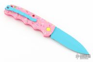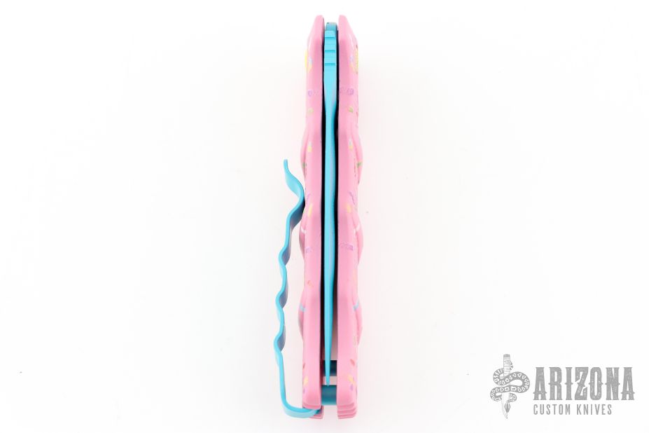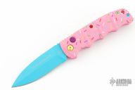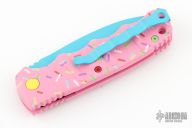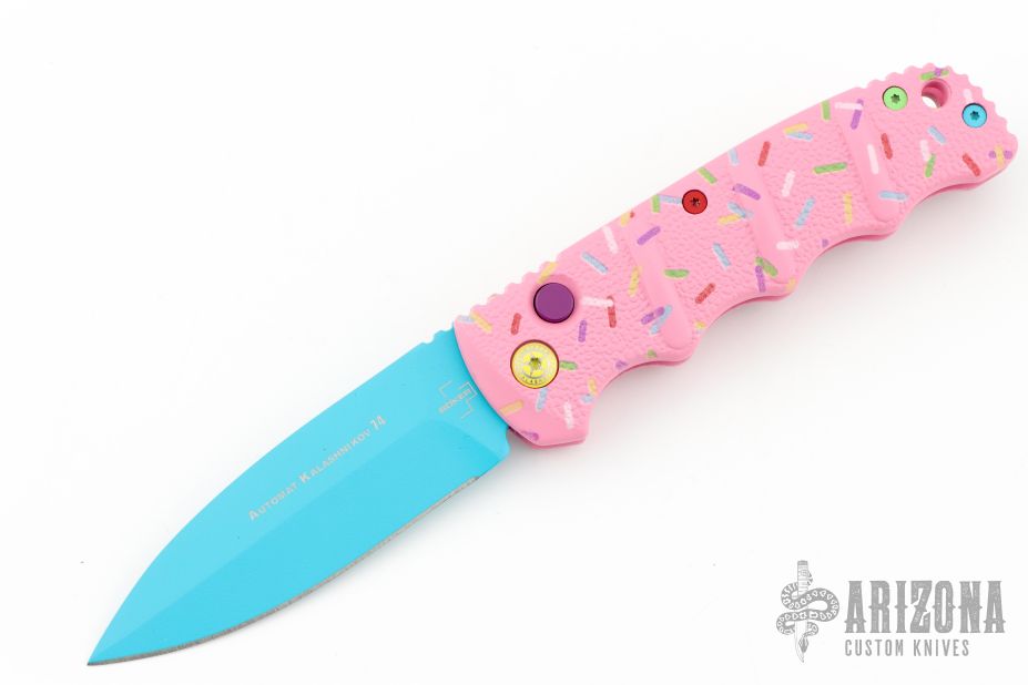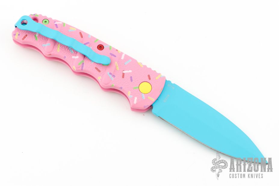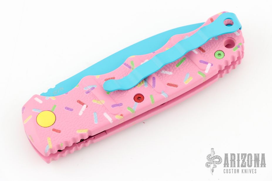 Have you ever been unfortunate enough to have to share a donut? Your plight only gets worse when you find you have to cover your high-speed, low-drag, modified, custom, mirror-edged piece of pocket jewelry in sticky sweetness. What you need is a knife designed from the ground up to go to war with a donut. And although its path to existence was unorthodox, the Dessert Warrior is here! This automatic will snap open before anyone can take more than their half of the donut. The handle is bright pink with sprinkles, and the blade has a candy blue finish, making the knife blend in with the pretty pastries of the shop. Gone are the days of not having the right tool for the job!
