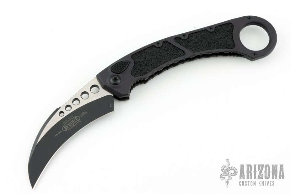 This Hawk Auto Karambit from Microtech has a black finished hawkbill blade. Handle is black anodized aluminum with black titanium tip down clip. Action is quick and strong. Excellent condition. S/N 2428. Dated 02/2024. Comes with original box and papers. Excellent condition.