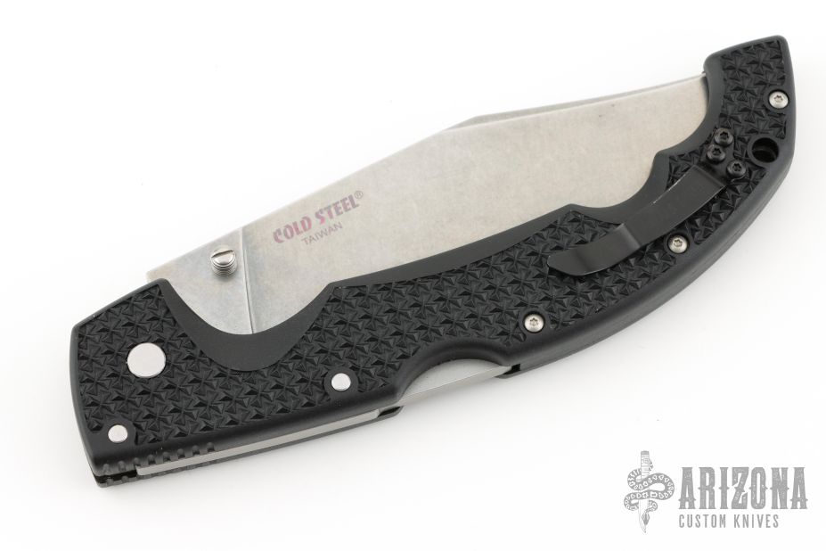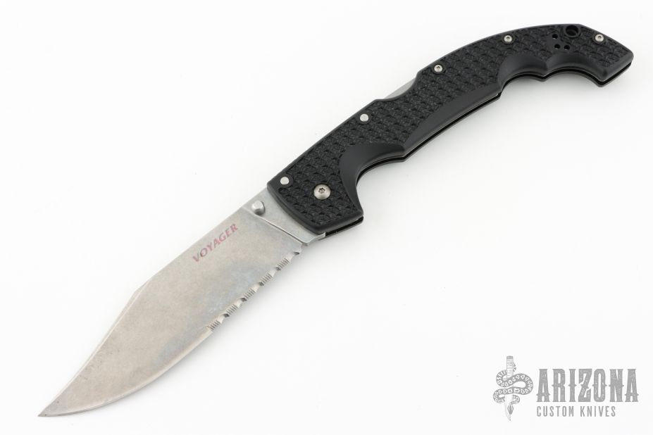 This Extra Large Voyager by Cold Steel features a stonewash finished partially serrated blade with dual thumbstuds. The handle has Zytel scales with stainless steel backspacer, black stainless steel tip up clip. Comes with original box. Excellent condition.