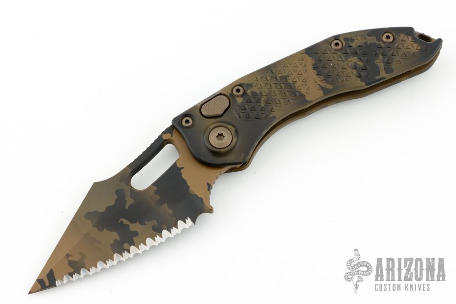 This Stitch Auto by Microtech Knives features a fully serrated coyote camo coated blade and false top edge, notched thumb and finger rests. The handle has an urban camo coated anodized and milled aluminum handle with a titanium backspacer, stainless steel hardware and clip, tip up carry, lanyard hole at the butt. Comes with original box and papers. S/N 093 and dated 12/2022. Excellent condition.