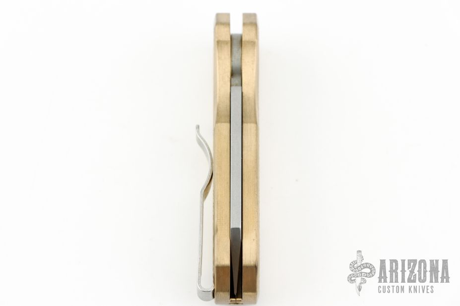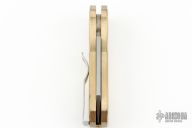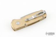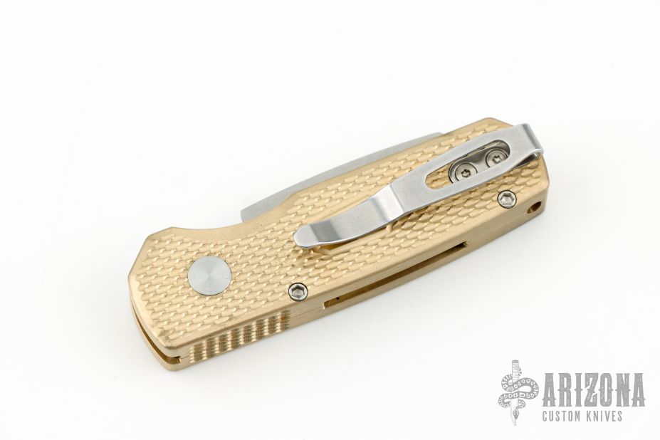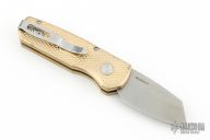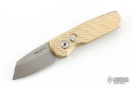 This Runt by Pro-Tech features a stonewashed Magnacut blade.  The handle features a textured bronze aluminum frame with milled thumbrest, a stainless steel tip up pocket clip and a black lip pearl push button.  Comes with original box and papers. Excellent Condition.