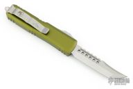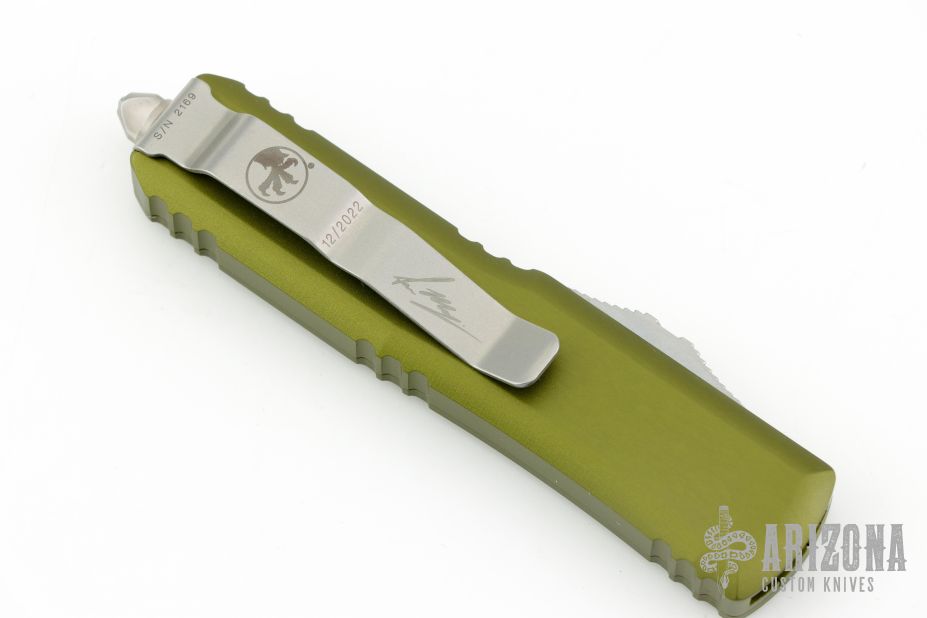 This UTX-85 by Microtech features a stonewashed tanto blade with satin flats and fullers. The handle has a OD Green aluminum frame with blasted hardware and tip down clip. S/N 2169 and dated 12/2022. Comes with original box and papers. Excellent condition.