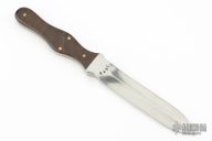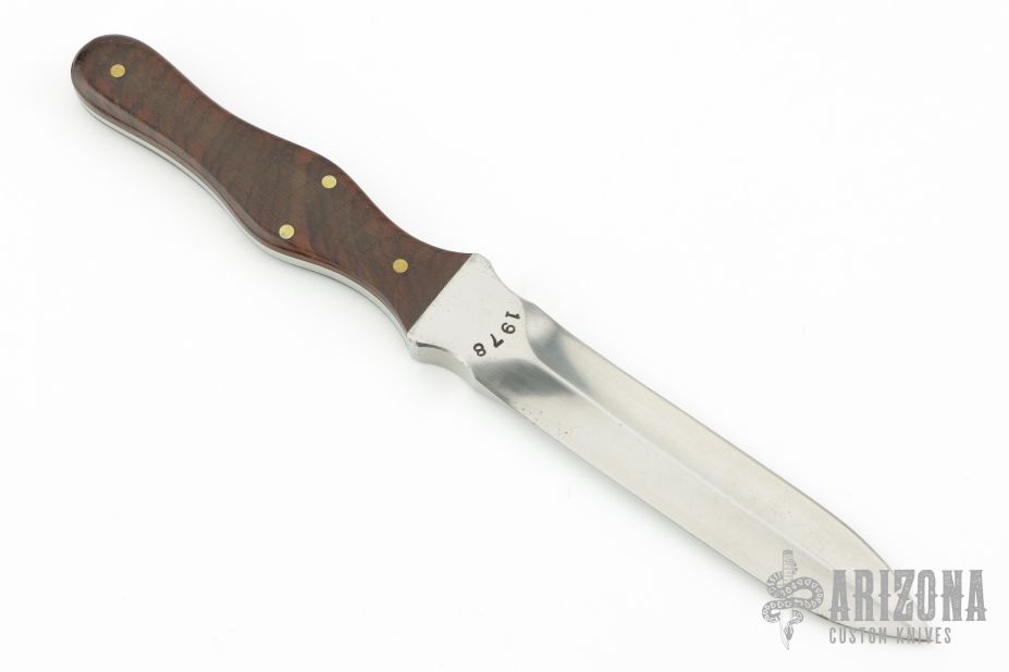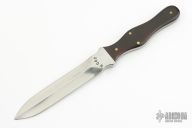 This boot dagger by WW Wood features a hand rub satin finished blade with .375" blade stock and .842" blade depth, full tapered tang construction. The handle has pinned wood grip. Has a couple light scratches, otherwise excellent condition. Comes with COA dated 11-14-92.