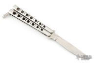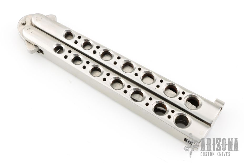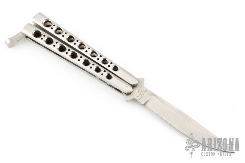 This early balisong from Pacific Cutlery features a Jody Samson ground satin finished blade. The handles are stainless steel with hole pattern. Comes with a belt sheath. The knife has some marks on the blade, handle and latch. Good condition otherwise.