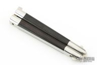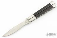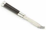 This early balisong from Pacific Cutlery features a Jody Samson ground satin finished blade with swedge. The handles are stainless steel with dovetail black linen micarta inlays, has t-latch. Comes in the original cocoon nylon sheath. There are a couple light scuffs and scratches, excellent condition otherwise and for its age.