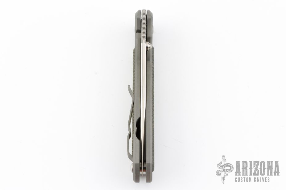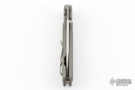 This Large Sebenza 21 by Chris Reeve Knives features a tumble finished drop point blade with single thumbstud and notched thumbrest. The handle has a bead blasted titanium frame with black canvas micarta inlays. Bead blast titanium clip, tip up carry. Comes with original box, tool, lanyard and card dated September 1, 2009. Has a couple light scuffs, excellent condition otherwise.