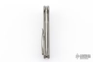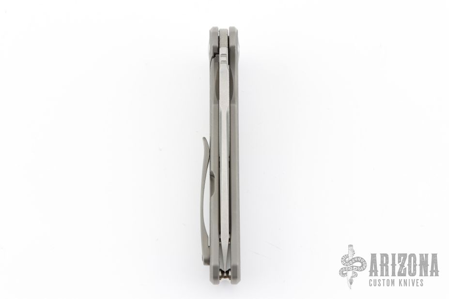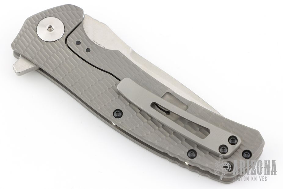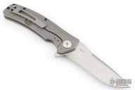 This Horizon B features a stonewashed recurve blade with false top edge, notched thumbrest and flipper. The handle has a milled titanium frame with matching tip up clip. Nice detent, lockup and blade seating. Comes with original box and zipper case. Excellent condition.