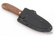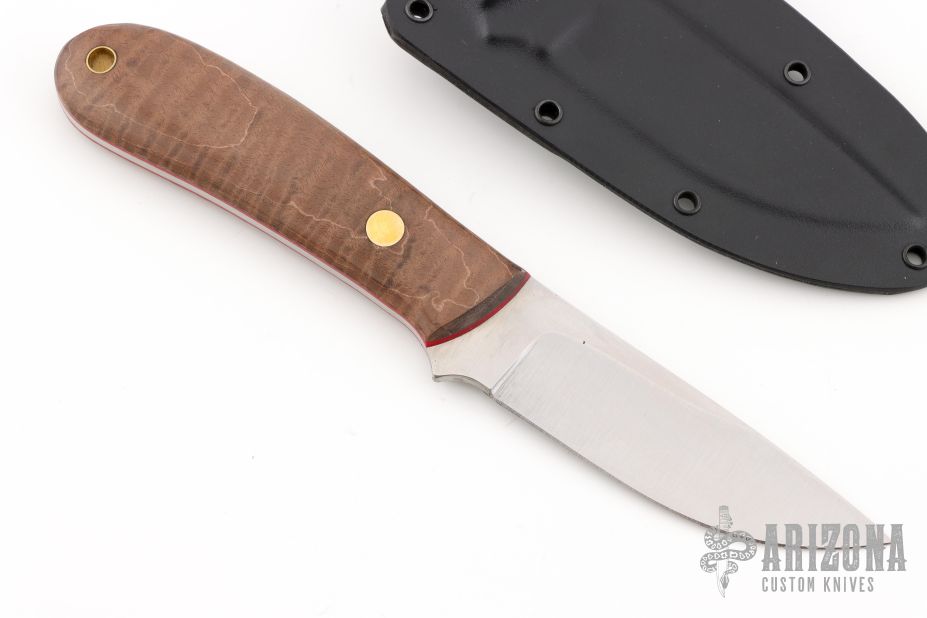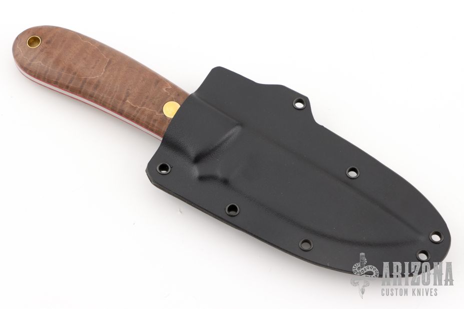 This K-16 Yukon Pro Skinner by Dozier Knives features a satin finished blade with .133" blade stock and 1.034" blade depth, full tang construction. The handle has brown quilted maple scales with red liners, brass pins and lanyard hole. Comes with kydex sheath with belt clip. New from maker.