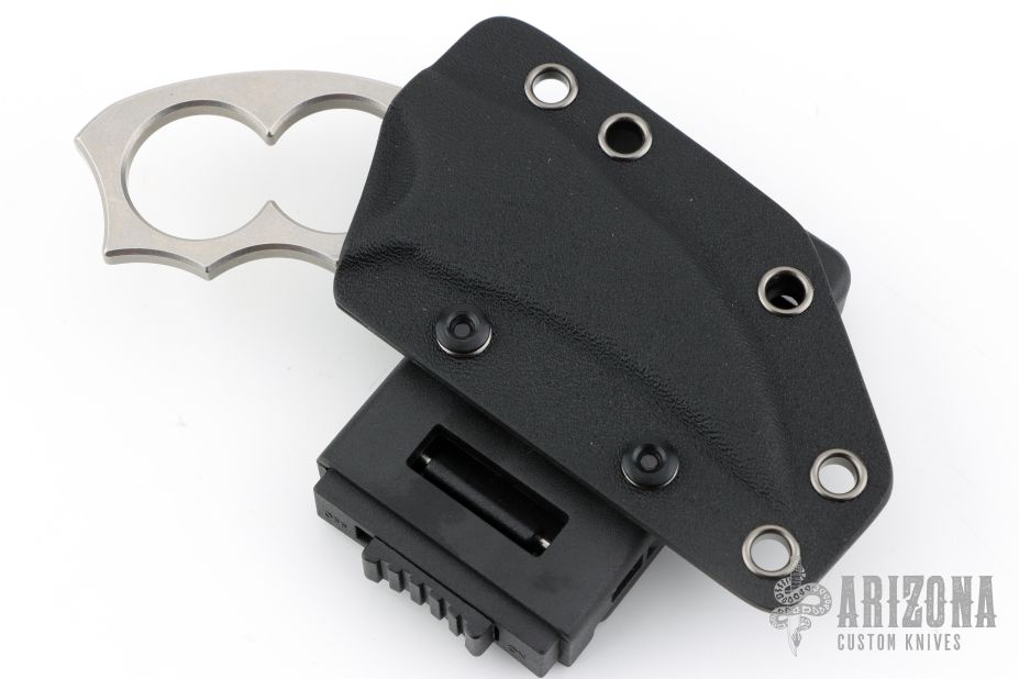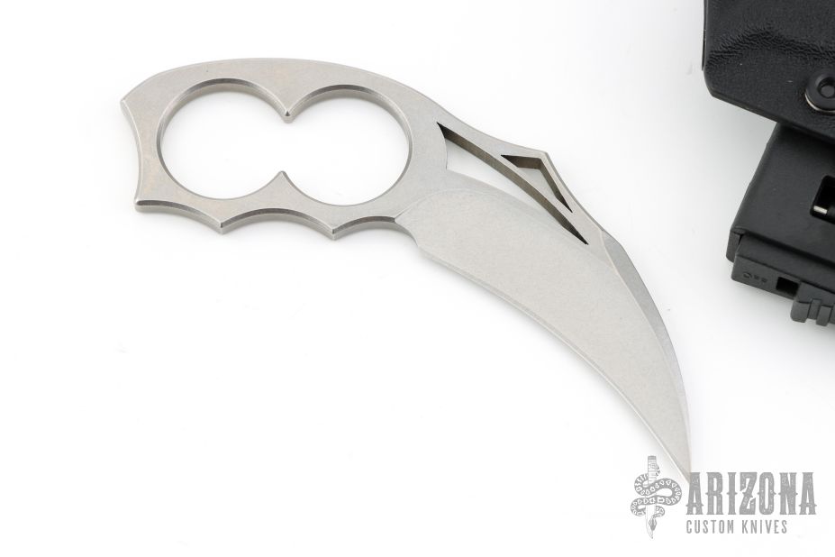 Inspired by our Enforcer folder, the Silent Enforcer is the newest addition to our neck knife lineup. The recurve blade is made from D2 tool steel and is flat ground by hand. The unique double finger hole design differs from our previous neck knives and provides added protection around the knuckles. This added benefit also makes it more effective in punching scenarios. The Silent Enforcer comes with a handmade kydex sheath.