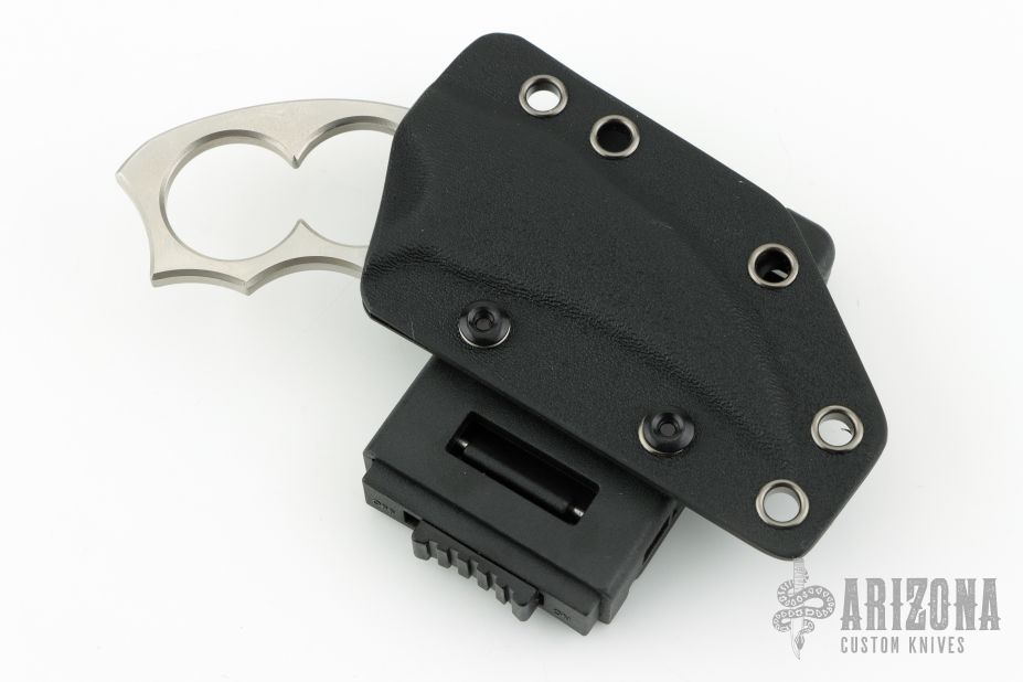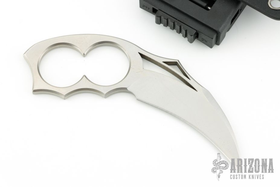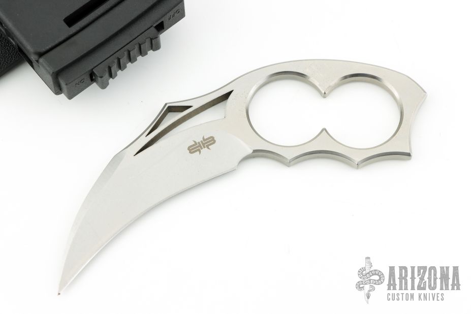 Inspired by our Enforcer folder, the Silent Enforcer is the newest addition to our neck knife lineup. The recurve blade is made from D2 tool steel and is flat ground by hand. The unique double finger hole design differs from our previous neck knives and provides added protection around the knuckles. This added benefit also makes it more effective in punching scenarios. The Silent Enforcer comes with a handmade kydex sheath.