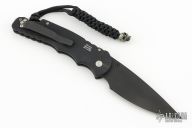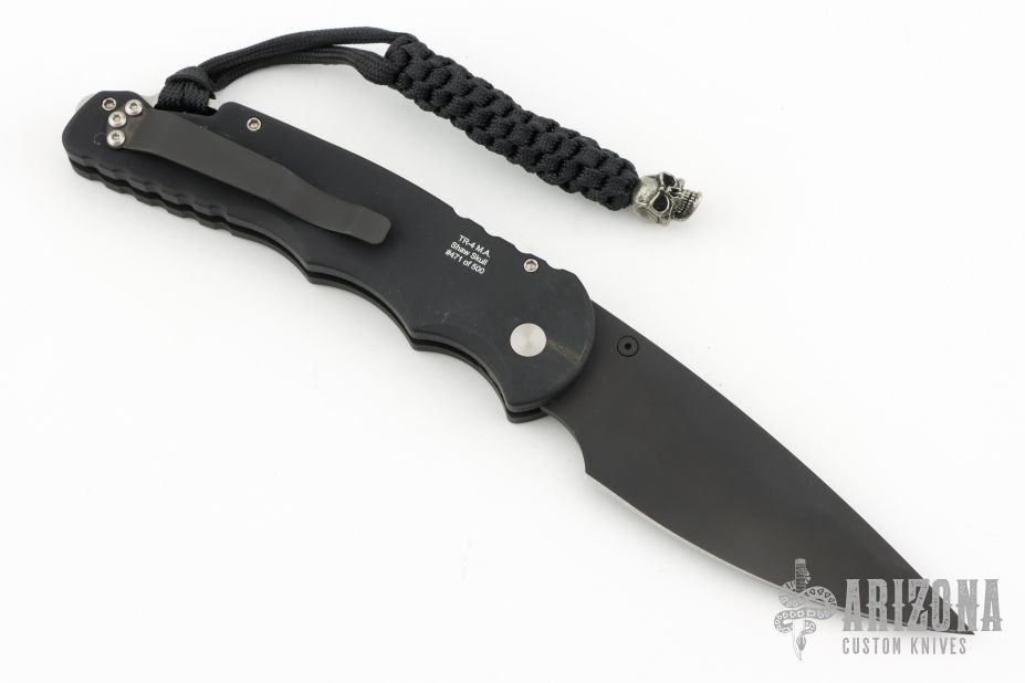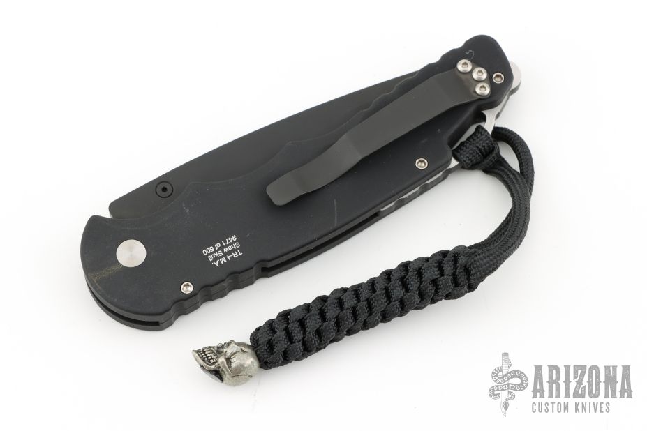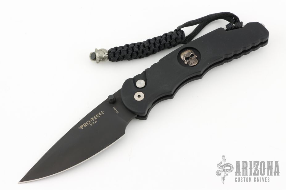This Protech Manual Action Skull features a DLC blade and a sterling silver skull designed by Bruce Shaw inlaid in the black aluminum handle. Satin stainless steel clip. Stainless steel push button. Serial number #471/500. Comes with original box, papers and sheath. Excellent condition.