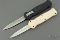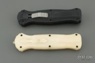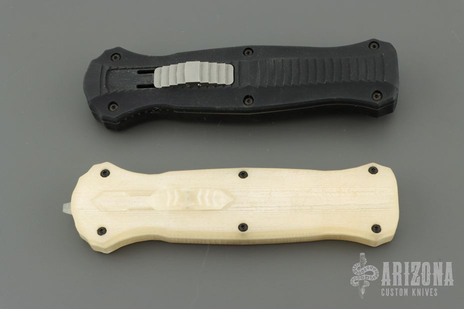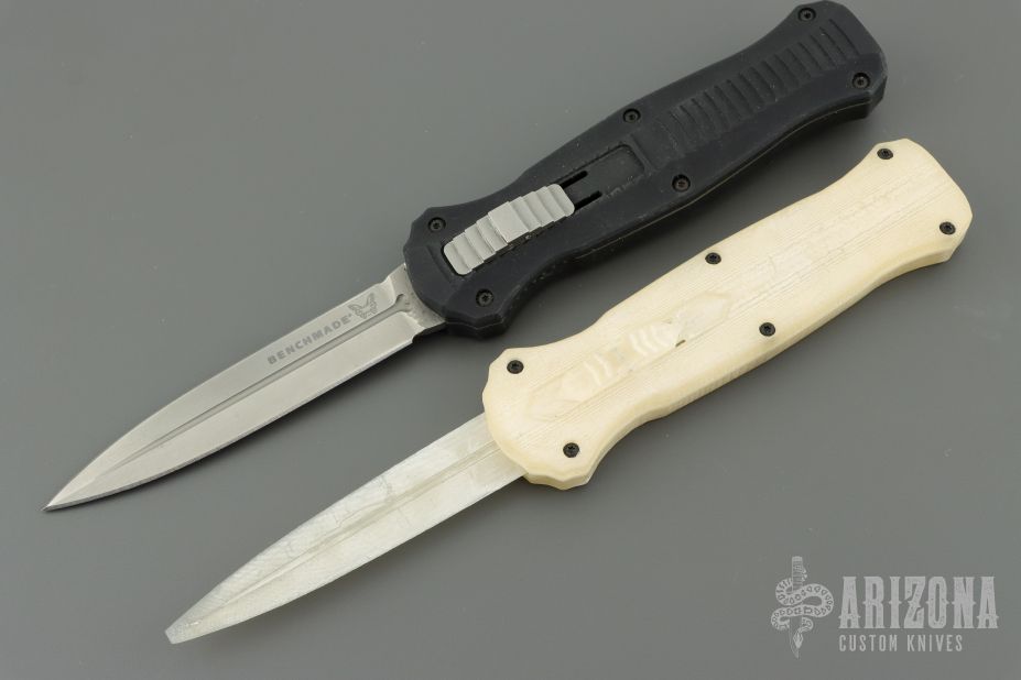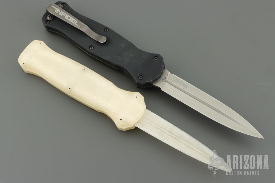 "Introducing an OTF like none-other.. The new Infidel® is rapidly making believers out of many a skeptic. Built for strength and reliability the patent pending double-action mechanics get it done over the long haul. Grab on and you will find the handle grip rock-solid with its patented machined in Presidio® style bi-directional tread pattern, and overall generous sizing for gloved hands. Intuitively pressure the release-slide forward and its spear-point edged steel fires and locks up with a unique three-point retention system with amazingly negligible blade play. Reverse the process and the blade retracts in a rapid blur of motion. The Benchmade Infidel is a special operator’s fantasy come true." Comes with original box, papers and belt sheath. Excellent condition. Comes with a 3D printed Mock Up