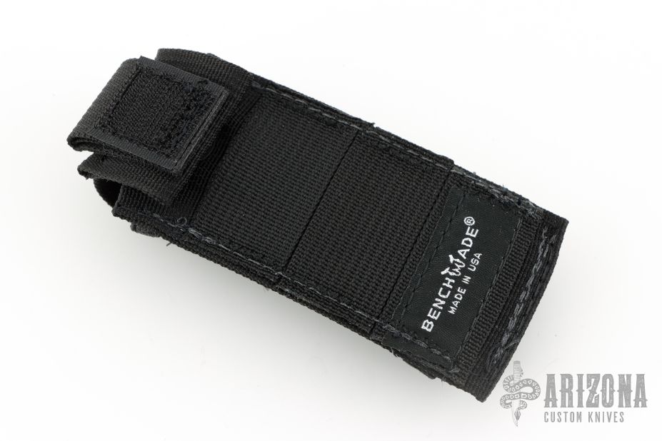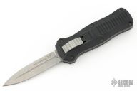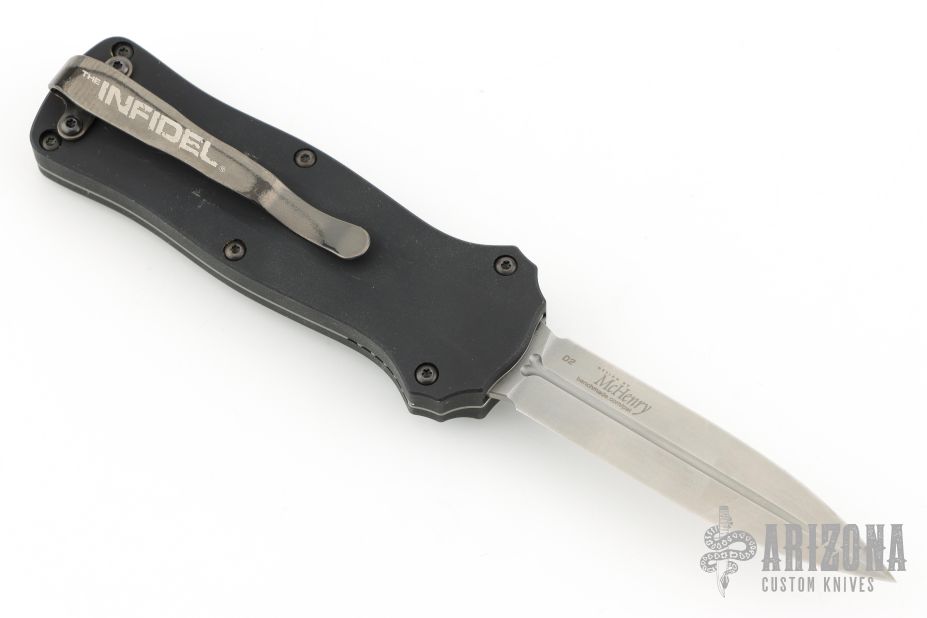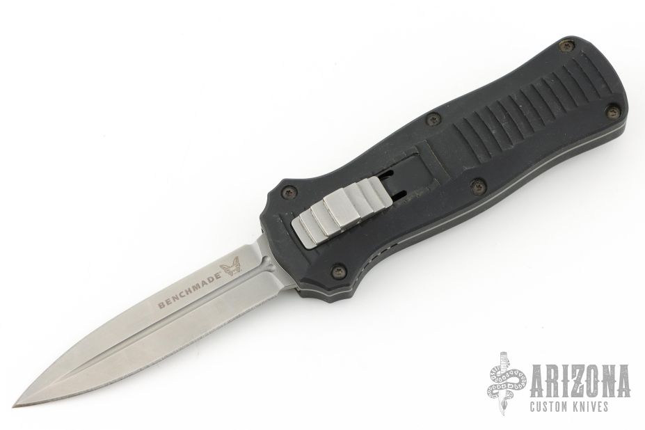 This 3350 Mini-Infidel by Benchmade features a stonesahed double edge dagger style D2 blade with fullers. The handle has a black anodized aluminum frame, ramped steel thumb slide and steel tip down clip. Comes with original box, sheath and papers. Has a stain on the clip, otherwise excellent condition.