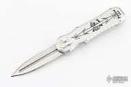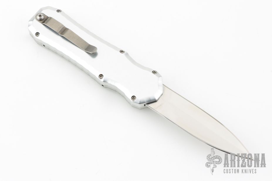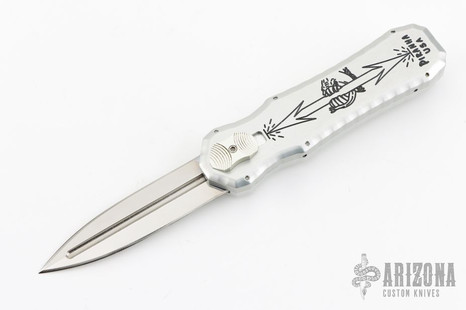 This Excalibur OTF from Piranha Knives features a mirror polished double edge blade with fuller. The handle has a silver aluminum with a tumbled tip down clip. Excellent Condition.