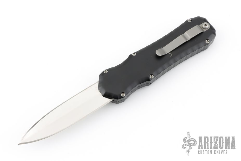 This Excalibur OTF from Piranha Knives features a mirror polished double edge blade with fuller. The handle has a black aluminum with a tumbled tip down clip. Has some minor wear on the frame, otherwise excellent condition.