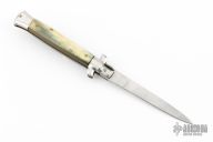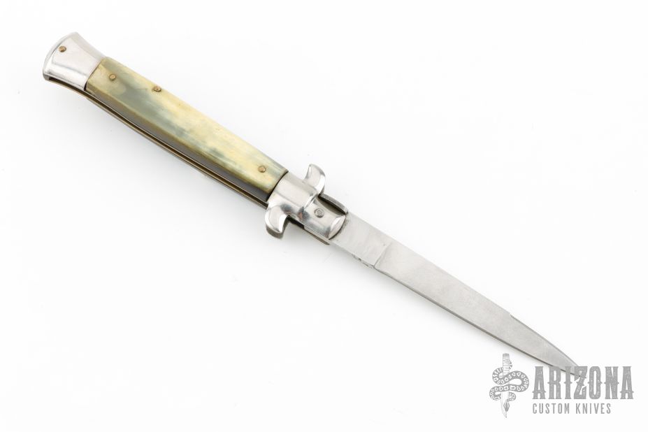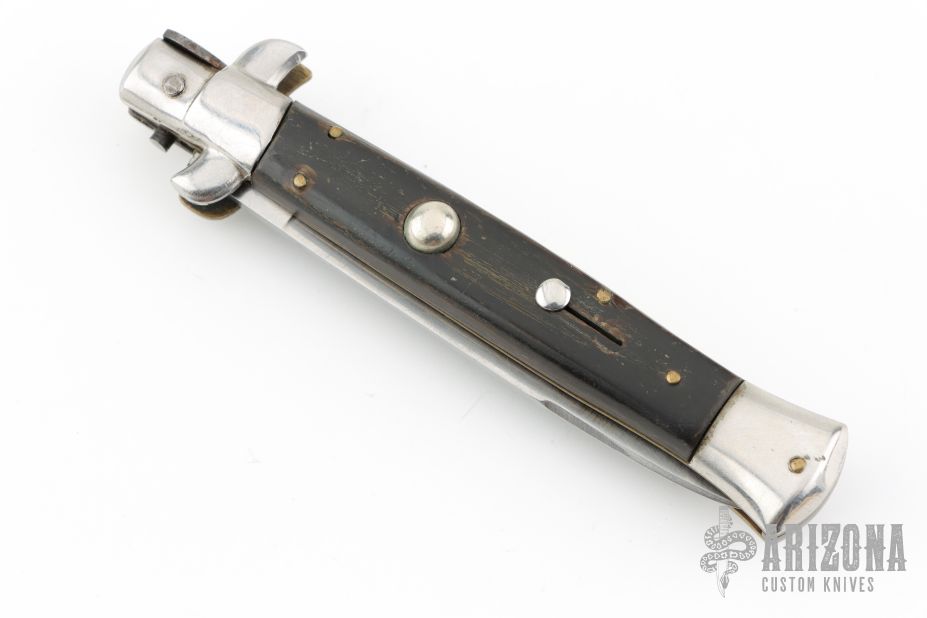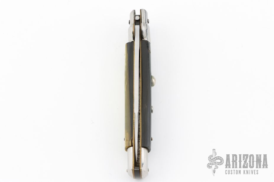 This Swivel Bolster features a bayonet ground blade. The handle has steel bolsters, front and rear, buffalo horn scales, brass liners, steel spring. Has scratches and blade play, otherwise fair condition.
