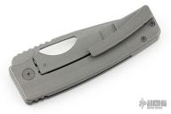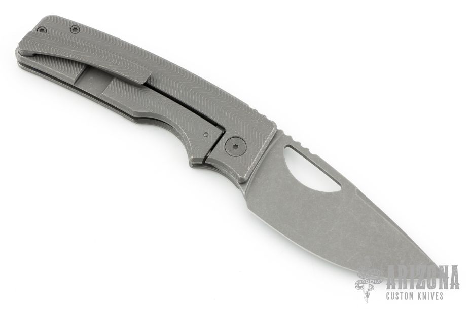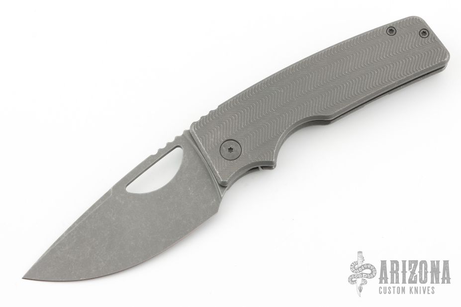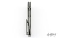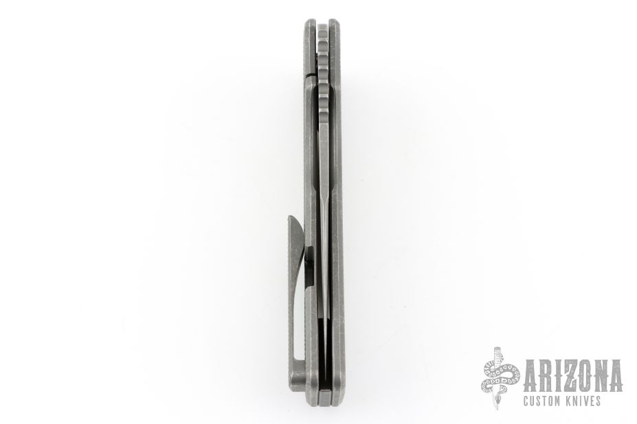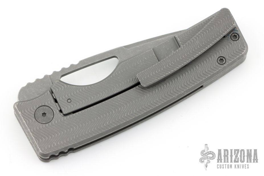This Roosevelt XL by the OZ Machine Company features a tumbled Vanax blade with thumbhole and notched thumbrest. The handle features a ZigZag milled stonewashed titanium frame with a titanium backspacer and tip up pocket clip with hidden screws. Includes original velcro case and papers dated 6-26-25 and s/n 0810. New from maker.