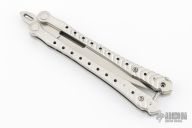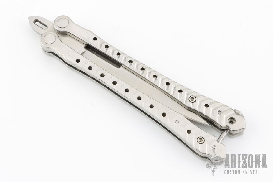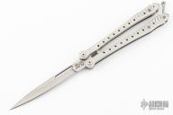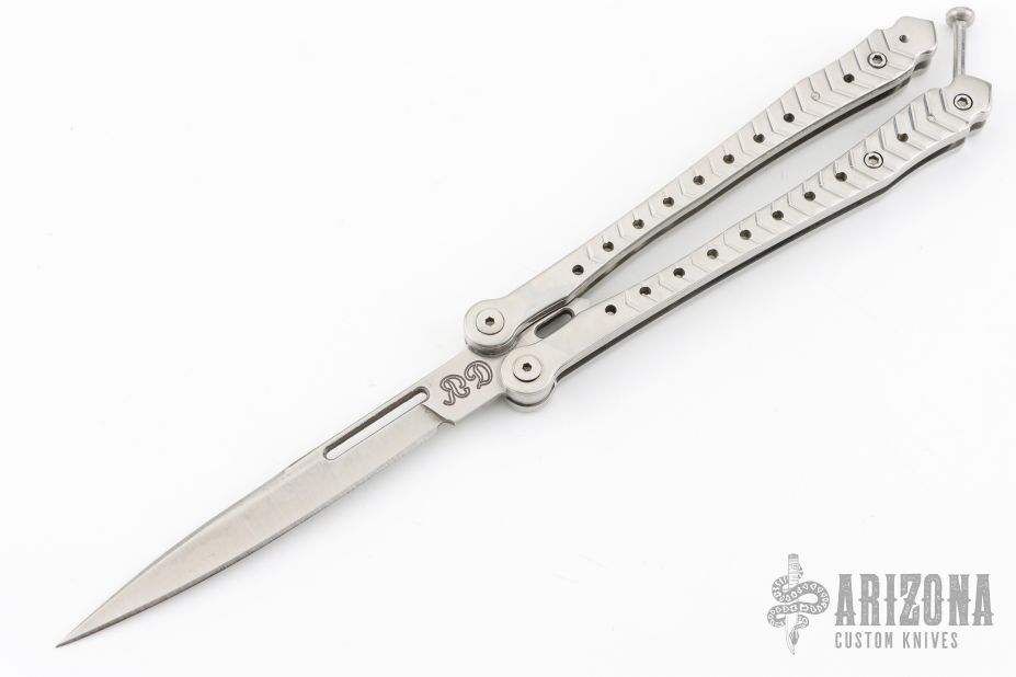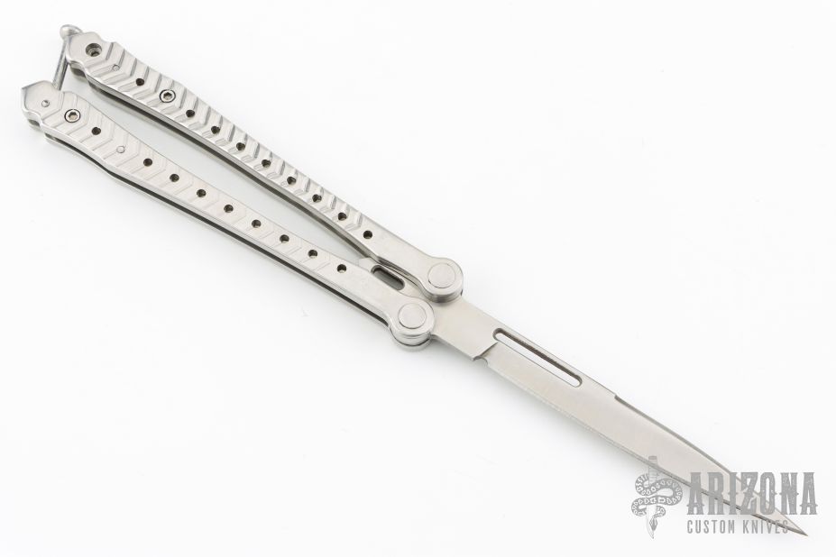 This Balisong by Rob Dalton features a blade. The handle has machined titanium over steel standoffs. Steel T latch on handle. Excellent Condition.