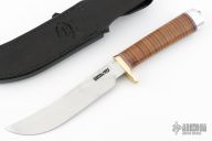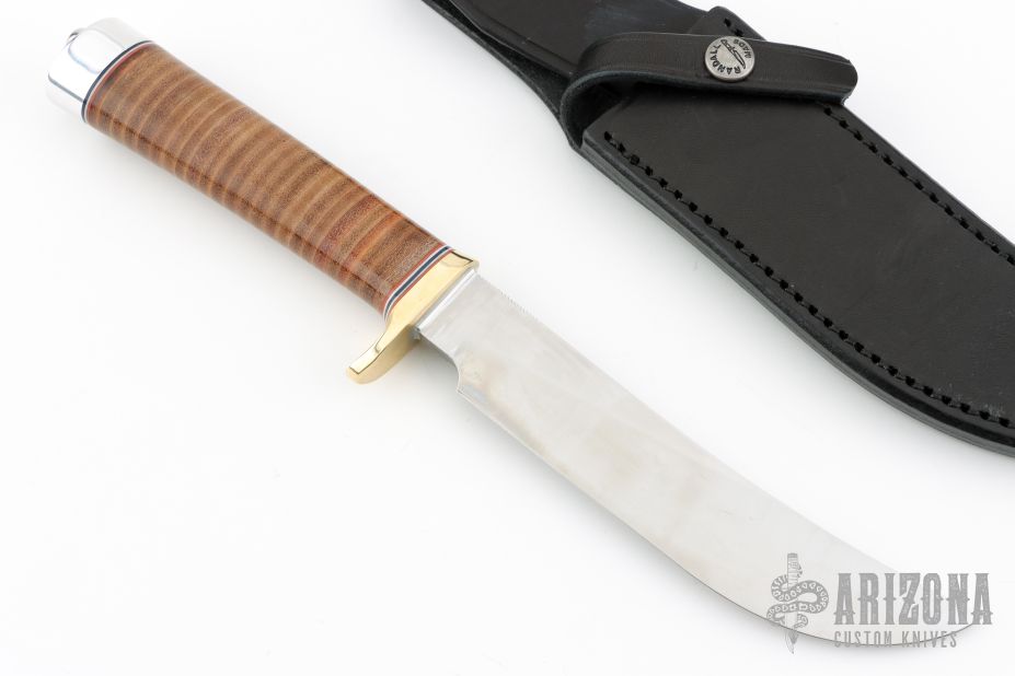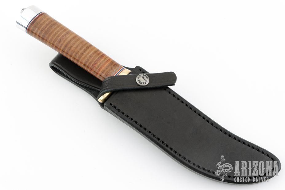The Model 4 is similar to Model 3, but with a more curved blade. This model has been extensively used by Alaskan and Canadian guides, trappers and sportsmen. This knife has a satin finished high carbon blade with notched thumbrest, .201" blade stock and 1.106" blade depth, hidden tang construction. The handle has a brass hilt, stacked leather handle, Duralumin butt cap, red/white/blue spacers. Comes with a black leather sheath and original paper wrapping. New from maker!