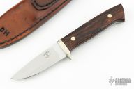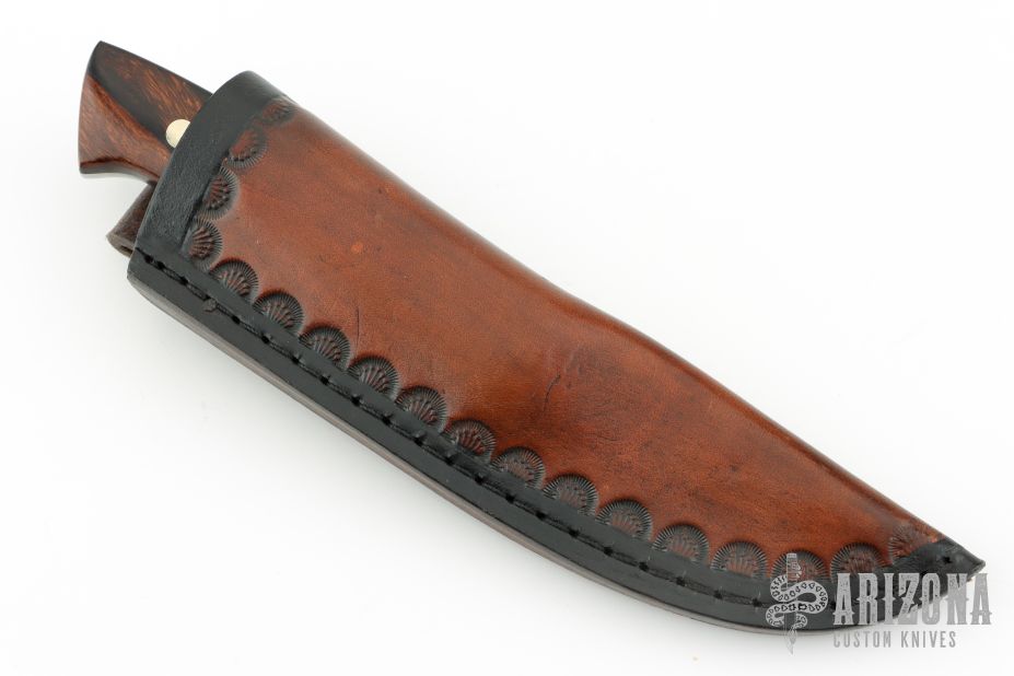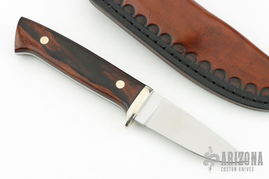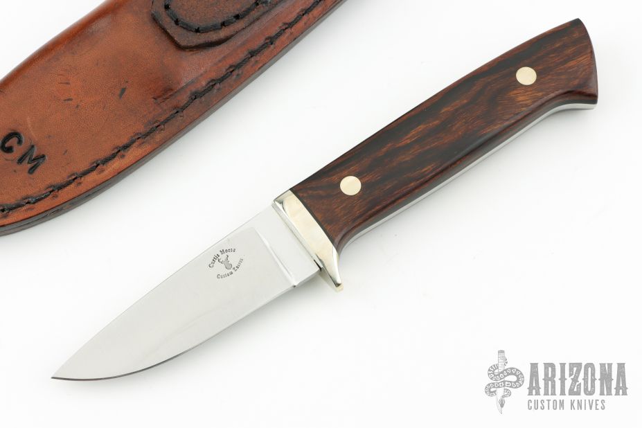 This knife by Curtis Morse features a satin finished blade with .125" blade stock and 1.019" blade depth, full tang construction. The handle has a nickel silver guard, Desert Ironwood scales with black liners and nickel silver pins. Comes with a hand tooled brown leather sheath. Has a few light scratches, otherwise excellent condition.