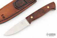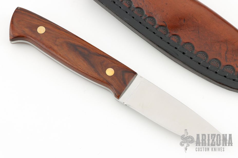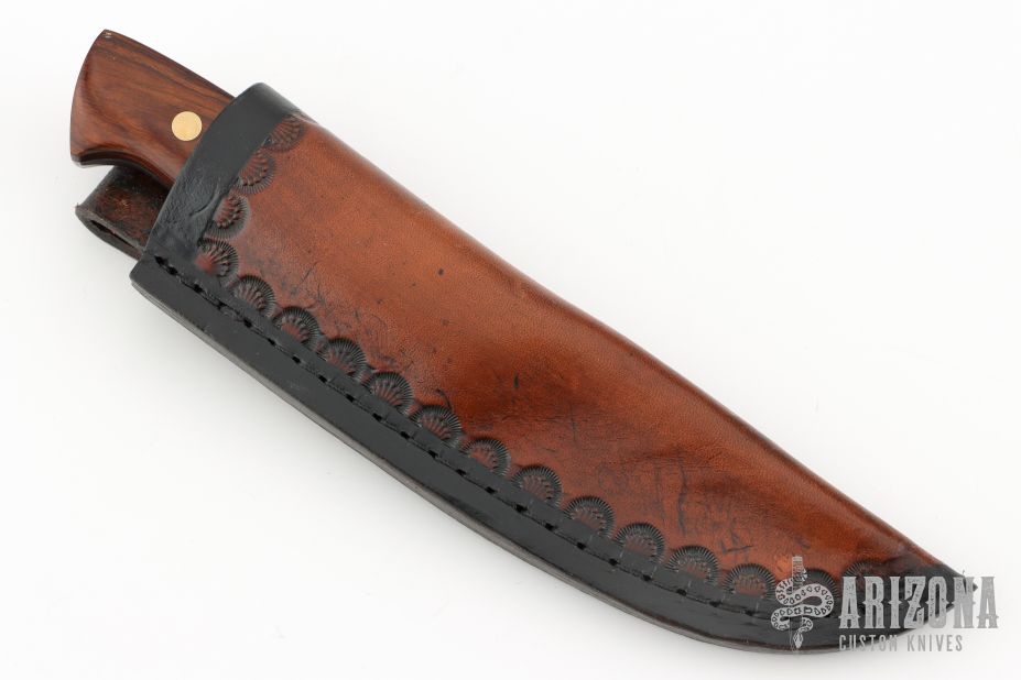This knife by Curtis Morse features a satin finished blade with .125" blade stock and 1.050" blade depth, full tang construction. The handle has ironwood scales with brass pins. Comes with a hand tooled brown leather sheath. Has a couple light scratches, otherwise excellent condition.