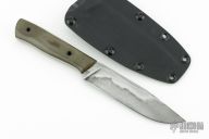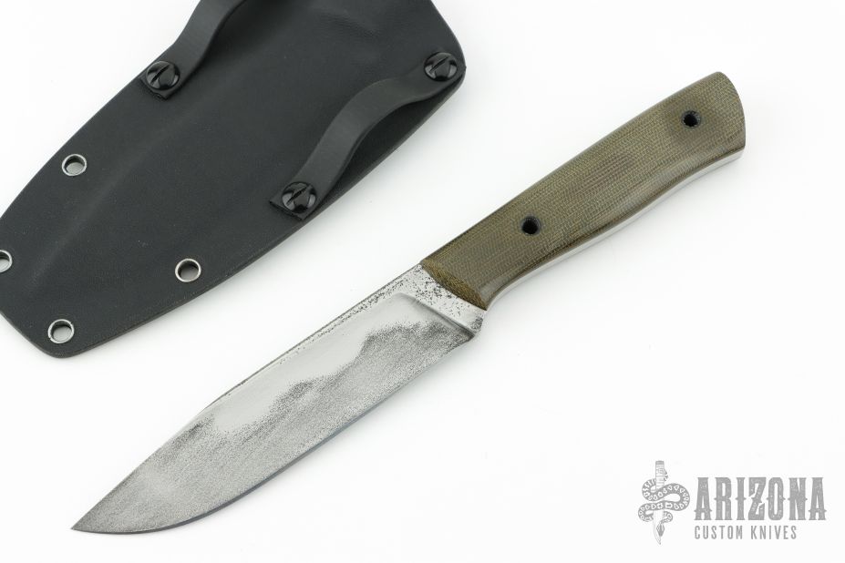 This knife features a satin finished blade with a forced hamon and a full tang construction.  .228" Blade Stock.  1.179" Blade Depth.  The blade is made from a 1950's ford tire iron.  The handle has green micarta scales.  Includes a Kydex sheath. New from maker!