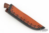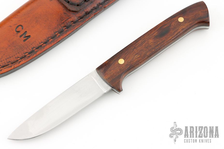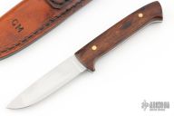 This knife by Curtis Morse features a satin finished blade with .125" blade stock and .817" blade depth, full tang construction. The handle has ironwood scales with brass pins and black liners. Comes with a hand tooled brown leather sheath. Has a small spot near the tip of the blade, otherwise excellent condition.