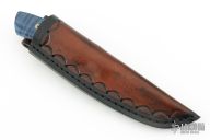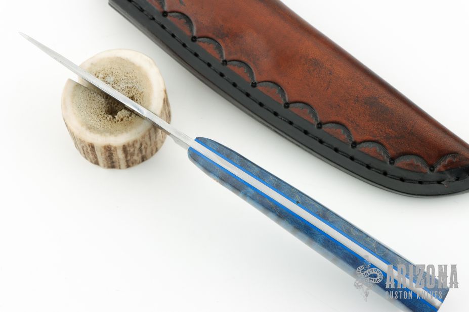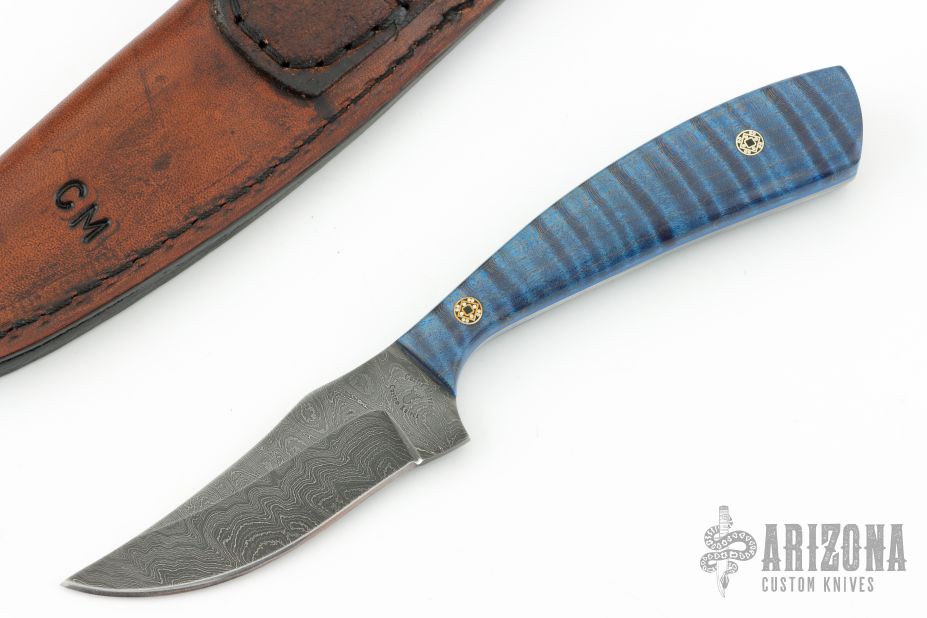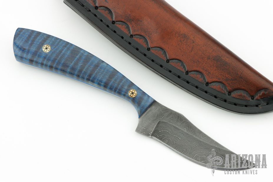 This knife by Curtis Morse features a Damascus blade with .122" blade stock and 1.100" blade depth, full tang construction. The handle has dyed curly maple scales with mosaic pins and blue liners. Comes with a hand tooled brown leather sheath. Excellent condition.