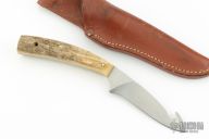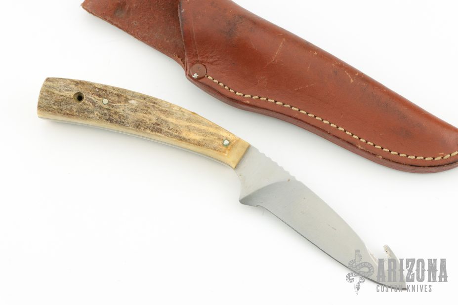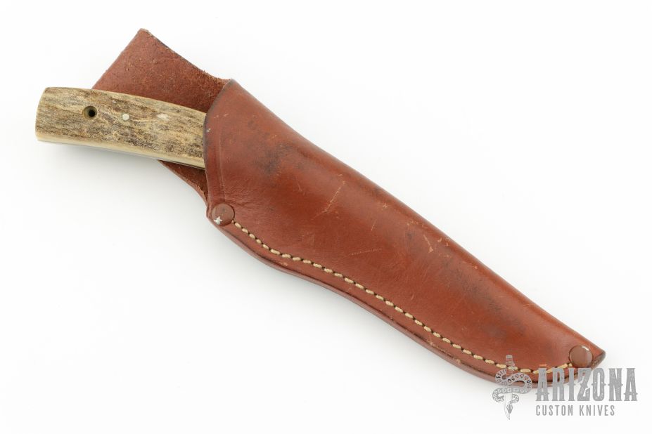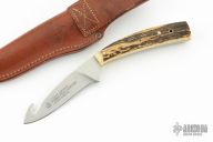 This Pro Hunter by Puma features a satin finished blade with notched thumbrest and guthook, .121" blade stock and .989" blade depth, full tang construction. The handle has stag scales and a lanyard hole. Comes with a brown leather sheath. Has some scratches and a couple small oxidation spots, otherwise good condition.