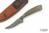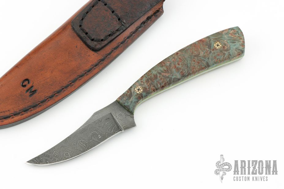 This knife by Curtis Morse features a Damascus blade with .124" blade stock and 1.105" blade depth, full tang construction. The handle has dyed and stabilized maple burl scales with mosaic pins and green liners. Comes with a hand tooled brown leather sheath. Excellent condition.