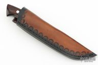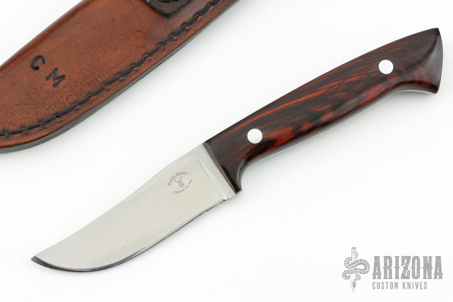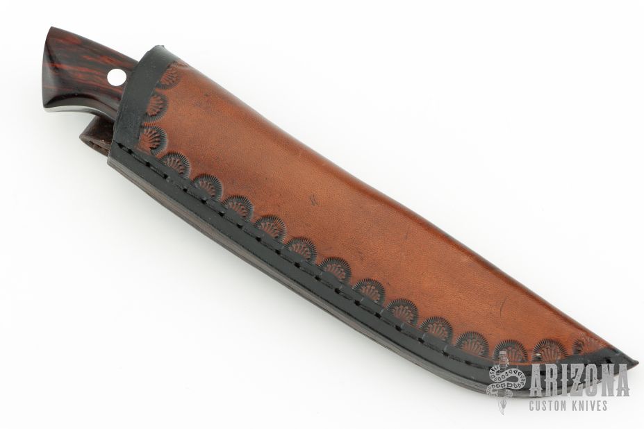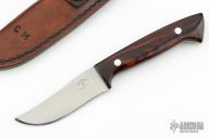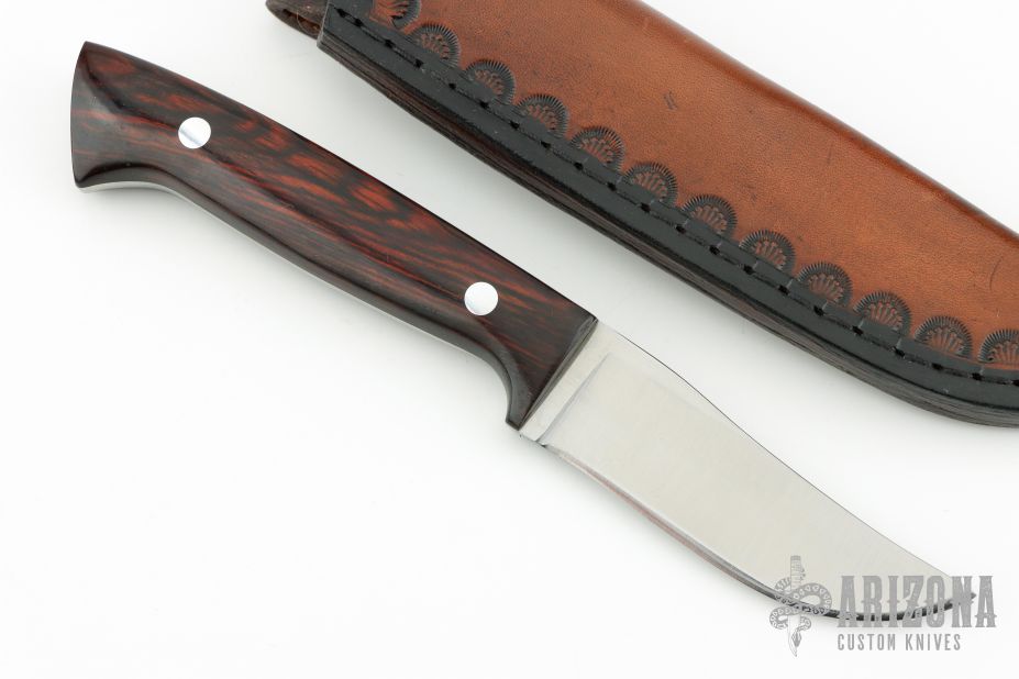 This knife by Curtis Morse features a satin finished blade with .126" blade stock and 1.042" blade depth, full tang construction. The handle has cocobolo scales with aluminum pins. Comes with a hand tooled brown leather sheath. Excellent condition.