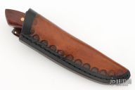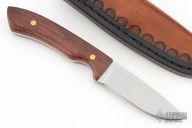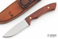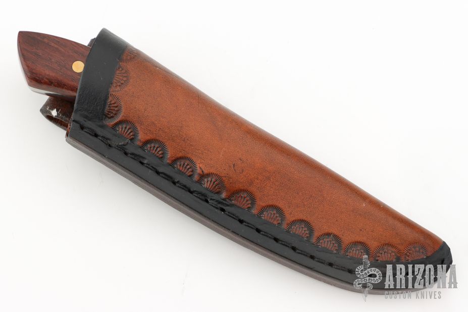 This knife by Curtis Morse features a satin finished blade with .128" blade stock and .868" blade depth, full tang construction. The handle has rosewood scales with brass pins. Comes with a hand tooled brown leather sheath. Excellent condition.