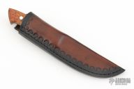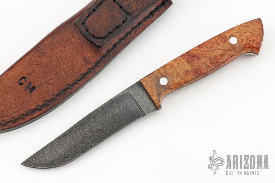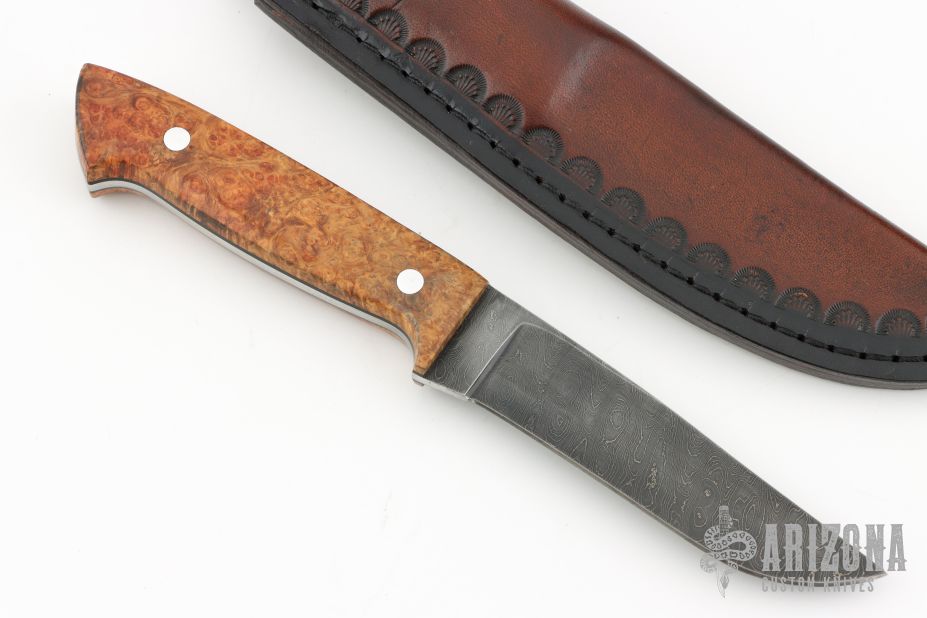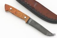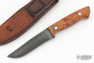 This knife by Curtis Morse features a Damascus blade with .129" blade stock and 1.082" blade depth, full tang construction. The handle has Amboyna burl scales with aluminum pins and black liners. Comes with a hand tooled brown leather sheath. Excellent condition.