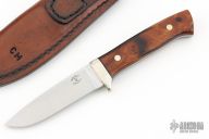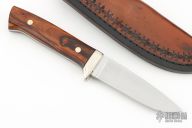 This knife by Curtis Morse features a satin finished blade with .162" blade stock and 1.082" blade depth, full tang construction. The handle has nickel silver guard and ironwood scales with black liners and nickel silver pins. Comes with a hand tooled brown leather sheath. Excellent condition.
