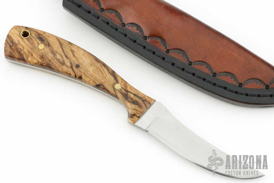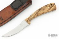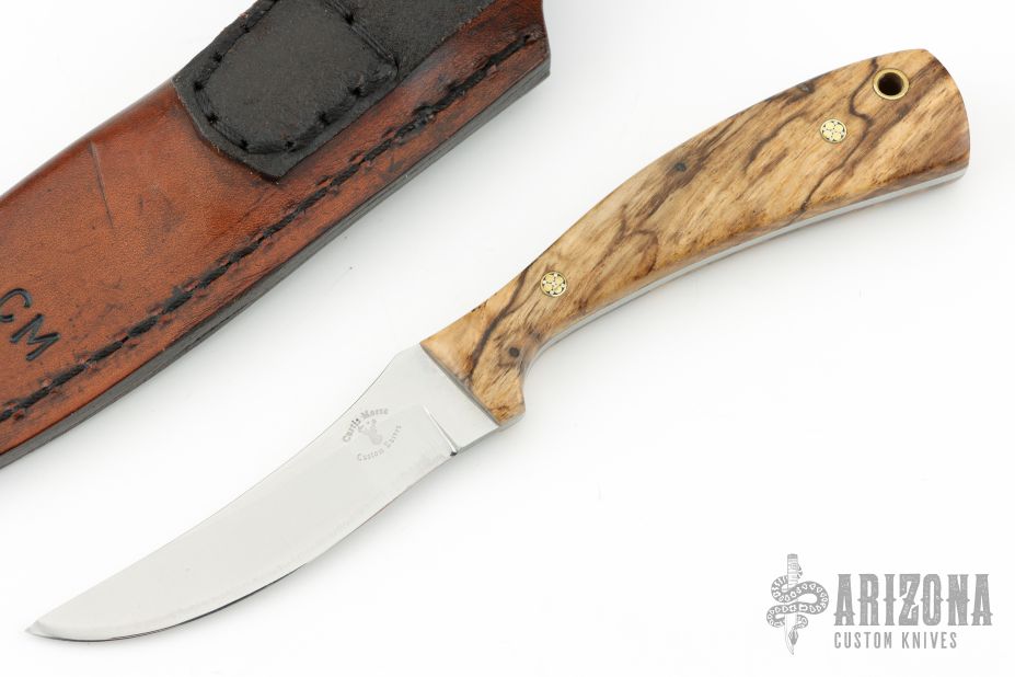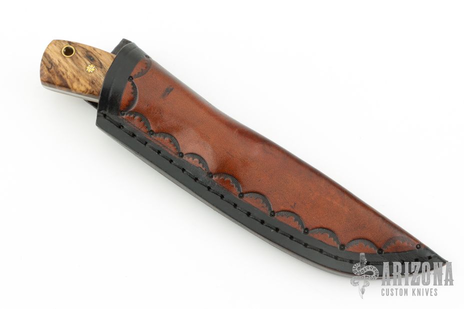 This knife by Curtis Morse features a satin finished blade with .127" blade stock and .848" blade depth, full tang construction. The handle has spalted oak scales with mosaic pins and a lanyard hole. Comes with a hand tooled brown leather sheath. Excellent condition.