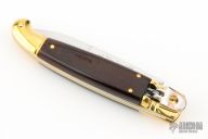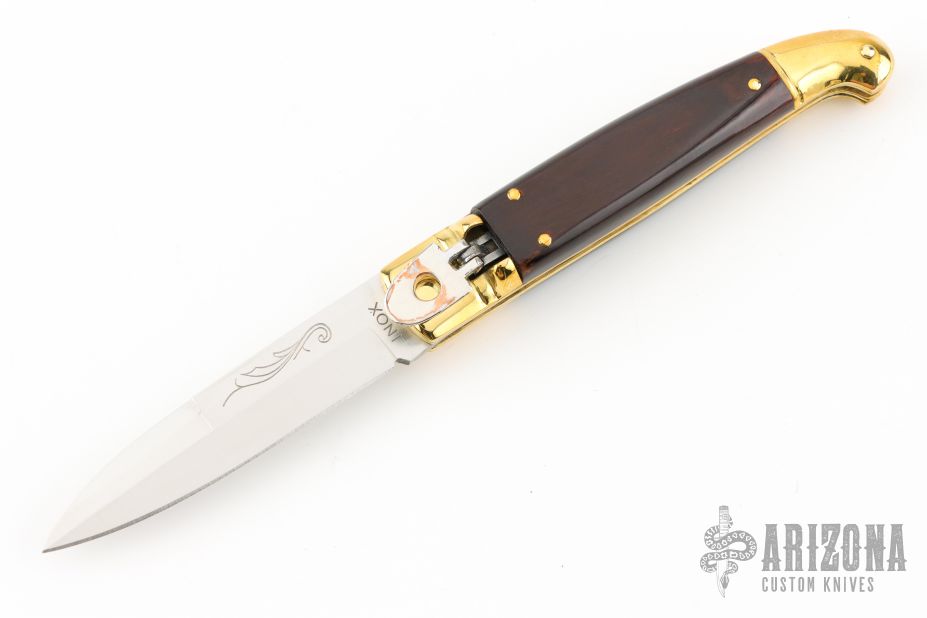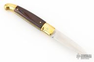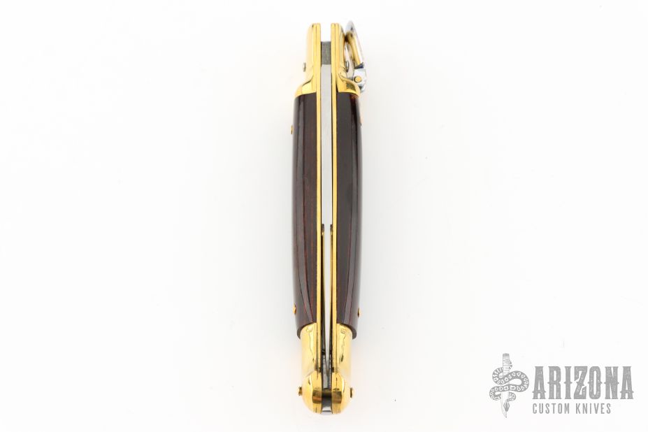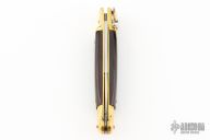 This leverlock auto features a satin finished blade with false top edge. The handle has brass bolsters and butt, dymondwood scales and brass liners. Excellent condition. Comes with a leather slip sheath. This knife has been tuned and polished by Greg Effects and comes with a COA.