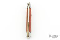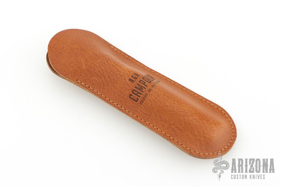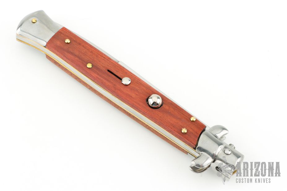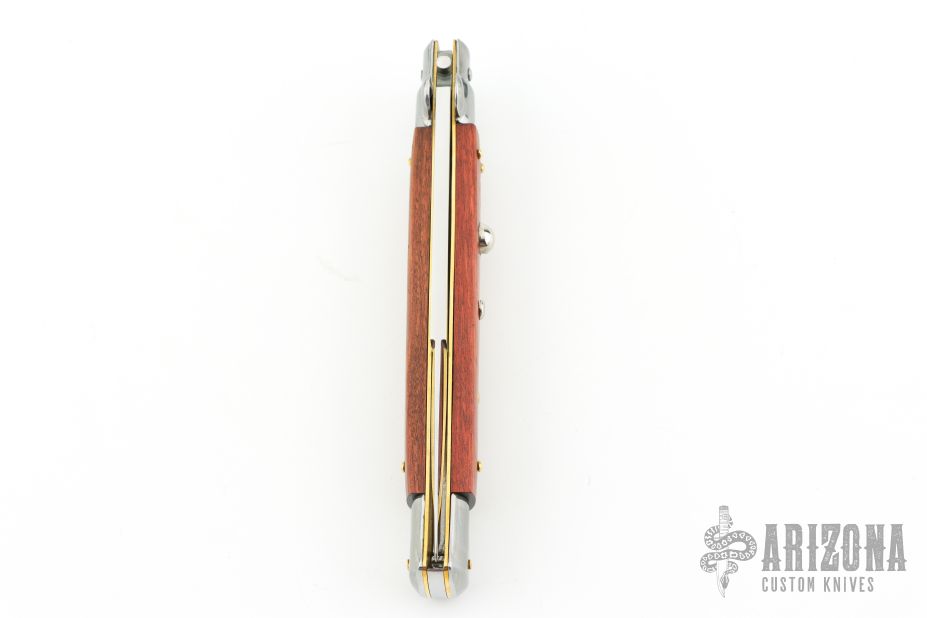 This Swivel Bolster Auto has a mirror polished bayonet ground blade with false top edge. The handle is composed of stainless steel front and rear bolsters, brass liners all complemented by wood scales. Comes with a leather sheath. This knife was tuned and polished by Greg Effects and comes with a COA. Excellent condition.