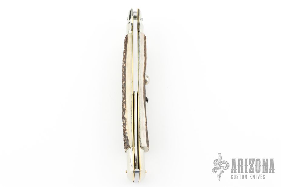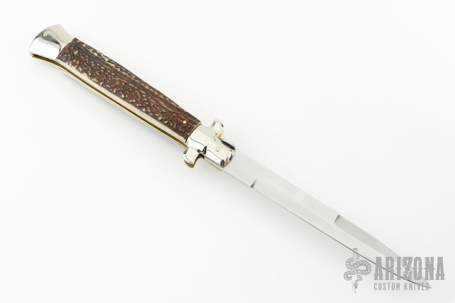 This Swivel Bolster Auto from A.G.A. Campolin features a mirror spear point blade with false top edge. The handle is comprised of nickel silver bolsters and pommel with stag scales over D-stamp brass liners and stainless steel backspacer. Comes with COA, and leather slip. This one was tuned and polished by Greg's Effects and has a COA.  Excellent condition.