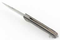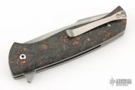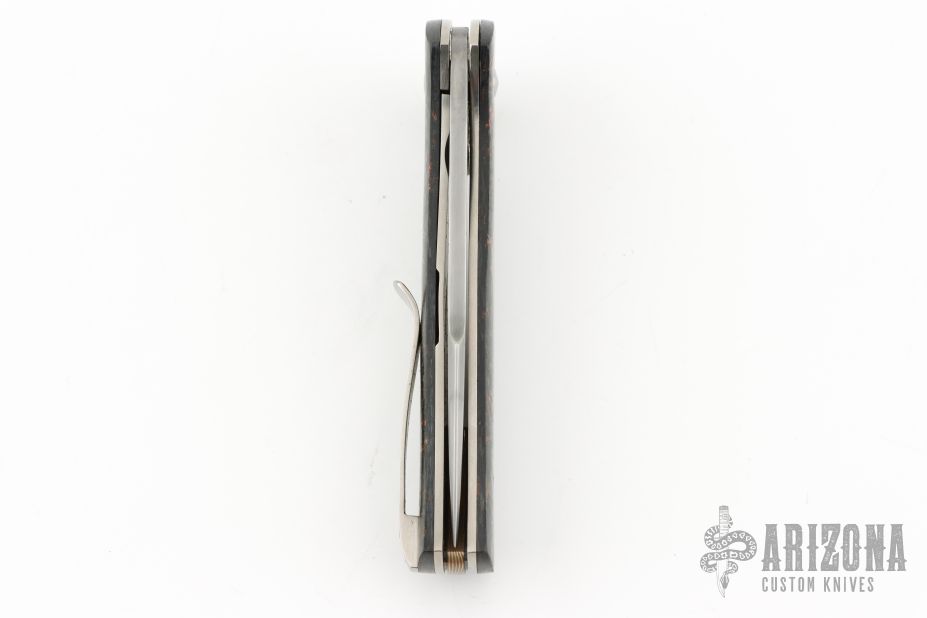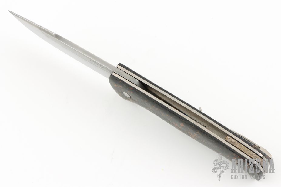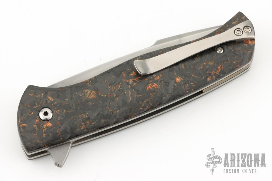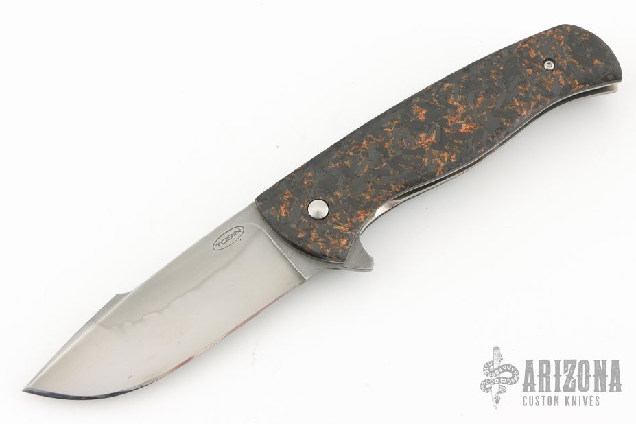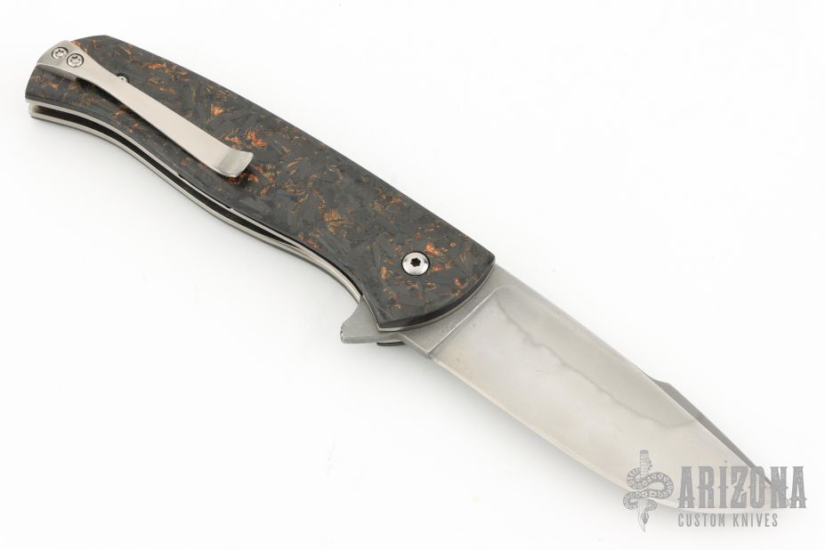 This Bullshark Flipper by Tobin Smith features a harpoon style blade with hamon. The handle has copper shred carbon fiber scales over titanium frame with a matching tip up pocket clip and a mokume backspacer.  Includes a padded zippered case.  Excellent Conition.